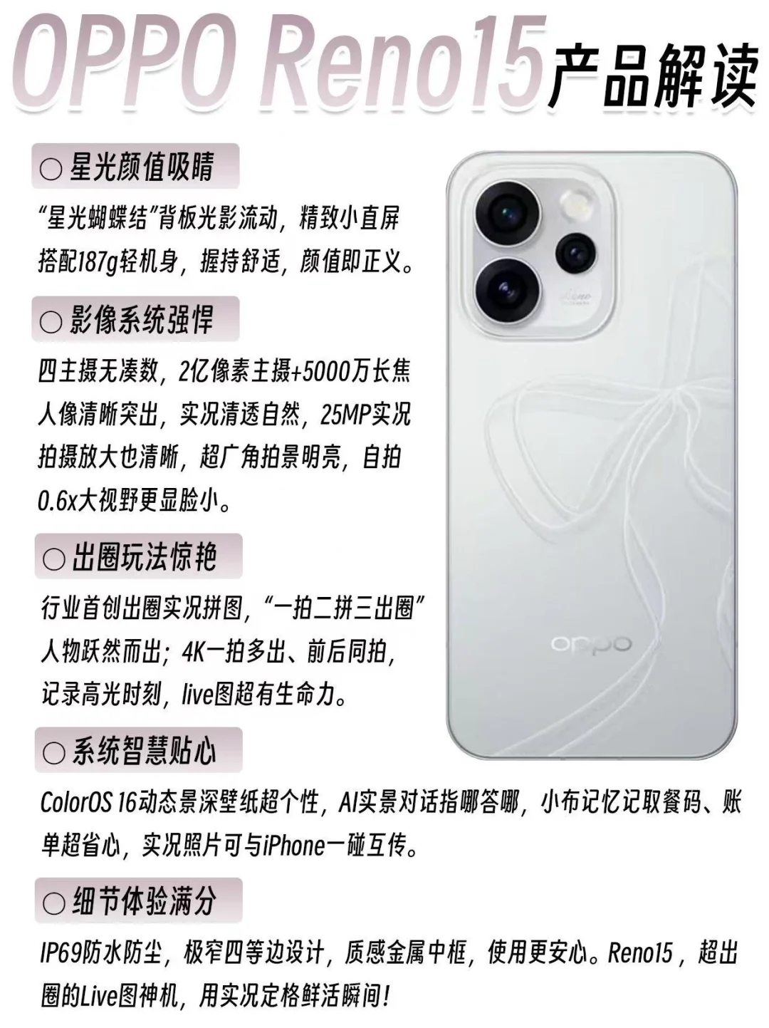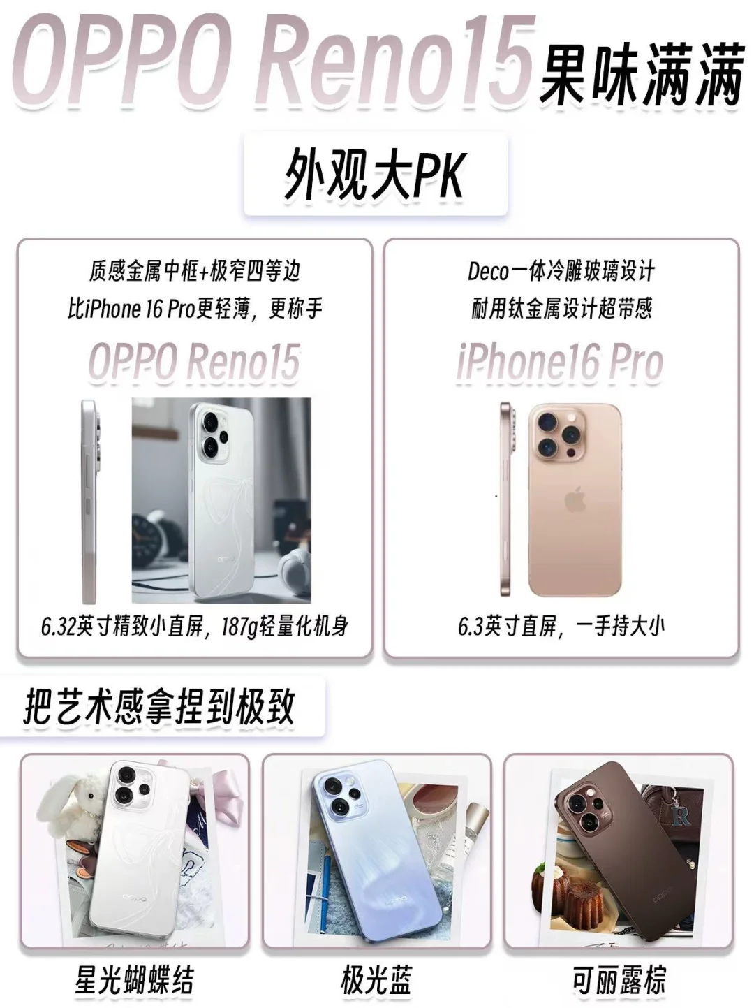 • 对比iPhone 16 Pro,Reno15 更轻薄,金属中框+极窄四等边设计,星光蝴蝶结,精致小直屏手感真的会非常舒适