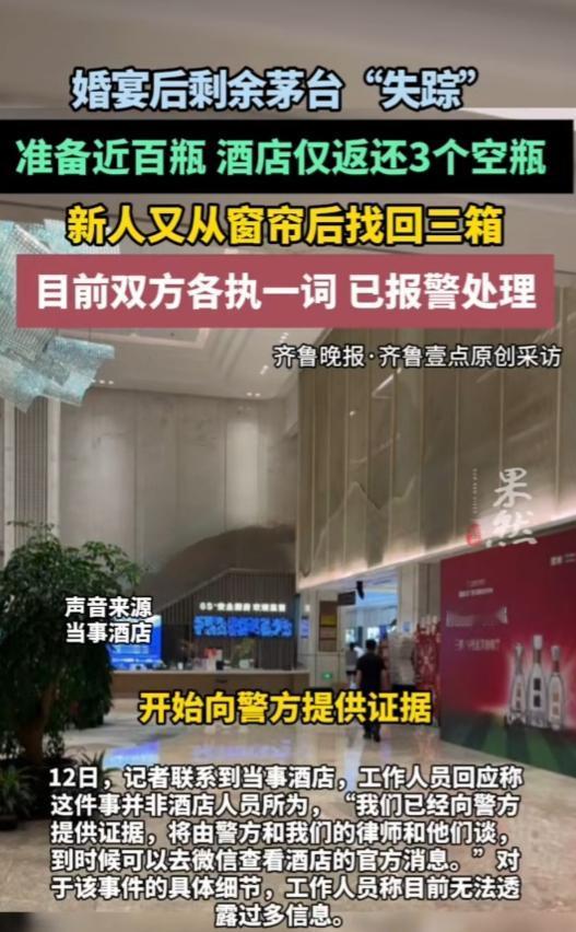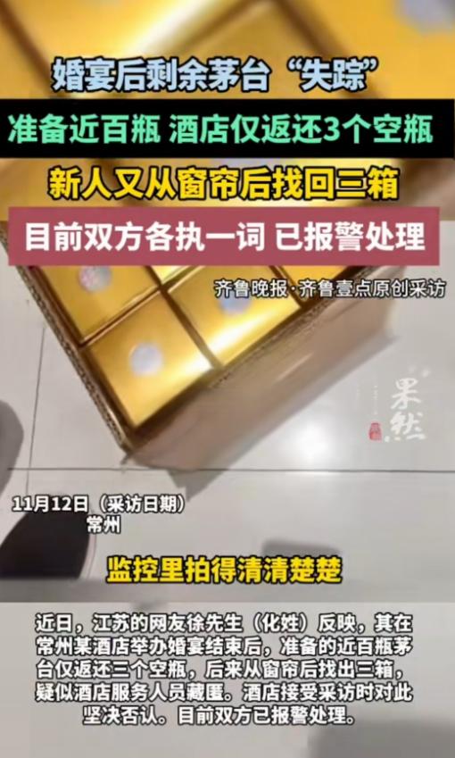 太离奇了!江苏常州,男子在酒店举办婚宴,准备了将近100瓶的茅台酒。宴席结束后,所有的酒,甚至连酒瓶都不见了,在男子多次追问下,服务员送回3个空酒瓶。男子找到酒店理论,酒店说,服务员不可能干这事!男子发动亲朋好友寻找,结果在宴会厅的窗帘后,发现了令人震惊的一幕。 十月下旬的江苏常州,一场本该被幸福与祝福填满的婚宴,却因近百瓶茅台酒的离奇失踪,变成了当事人徐先生心中难以释怀的糟心事。 为了款待前来道贺的亲朋好友,徐先生精心筹备了这场婚礼,光是用于宴席的茅台酒就准备了将近一百瓶,这些酒提前送至举办婚宴的酒店妥善保存,婚礼当天还特意安排了亲戚在现场看管。 可谁也没想到,热闹的宴席散场后,当徐先生等人着手清点剩余烟酒时,眼前的景象让所有人都愣住了。 数十桌宴席的餐桌上,只剩下杯盘狼藉的残羹剩菜,不仅没看到多少剩余的茅台酒,就连本该留下的空酒瓶也不见踪影。 徐先生赶紧找到负责宴席的服务员询问,起初对方要么摇头说没看到,要么直接否认拿过酒,在他反复追问下,服务员才勉强送回了三个空酒瓶。 这三个空酒瓶显然无法打消徐先生的疑虑,他和亲友们都清楚,当天来参加婚礼的人中,不少人是开车赴宴的,还有大量女宾本身就很少饮酒,很多餐桌上的两瓶酒甚至根本没打开过,按常理来说,应该会剩余不少酒才对。 带着满心的疑惑和不满,徐先生发动一同前来的亲朋好友在宴会厅内仔细搜寻,这一找,还真发现了令人震惊的情况。 有人在女宾桌旁的窗帘后面,找到了整整两箱茅台酒,紧接着,又有人在男宾桌旁的窗帘后发现了另一箱,这些酒里既有完全未开封的整瓶茅台,也有喝了一半的半瓶酒,还有一些空瓶,但即便加上这些找到的酒,数量也和大家预估的剩余量对不上。 更让徐先生起疑的是,掀开那层窗帘后面,竟然就是酒店的传菜间。 这样的布局意味着,如果有人想把这些酒转移出去,简直是易如反掌,而酒店服务员无疑是最方便接触到这个位置的人。 徐先生认为,自己花钱在酒店举办婚宴,酒店理应保障顾客的财产安全,如今酒品莫名失踪,酒店方面难辞其咎。 可当徐先生带着窗帘后找到三箱酒的证据,找到酒店负责人要求解释时,对方的态度却让他格外窝火。 酒店方面一口咬定,这件事绝对不是自家服务员干的,还辩称当时宴席场面大、来宾众多,人多手杂,不能把责任都算在酒店头上。 更让徐先生无法接受的是,酒店不仅一味否定、推脱责任,后来还指责他的说法影响了酒店声誉,甚至声称他在引导舆论,却始终拿不出能让人信服的理由。 双方各执一词,矛盾难以调和,徐先生在事发后不久就报了警。 本以为警方介入后事情能有进展,可没想到时间一天天过去,将近一个月的时间里,事情始终没有任何结果。 酒店方面的态度一直含糊不清,既不主动协商解决,也不给出明确答复,只是表示已经掌握了相关证据并提交给了警方,后续会由警方和酒店的律师与徐先生沟通,对于事件的具体细节,则以不方便透露为由拒绝回应,只说后续会通过酒店官方微信公布信息。 事情发酵后,也引发了不少网友的关注和讨论,大家的看法各不相同。 有网友猜测,会不会是宴席结束后,有些亲朋好友顺手把没喝完的酒打包带走了; 但也有网友表示,打包剩菜是常见的事,打包价值不菲的茅台酒却很少见,这事确实说不清楚,最关键的还是要靠监控录像和清点记录来还原真相。 徐先生后来坦言,当时负责看管烟酒的都是年轻人,没什么经验,再加上婚宴上人太多,场面比较混乱,才给了别有用心的人可乘之机。 而让他觉得有些遗憾的是,事发后没有第一时间想到调取监控,如今时间过去这么久,可能已经给拿走茅台酒的人留下了销毁证据的机会。 眼看着事情迟迟没有进展,徐先生实在没有办法,只能选择向媒体求助,希望能通过舆论的力量推动事情解决,让酒店给个合理的说法。 十一月十二日,记者联系到事发酒店,工作人员依旧坚持认为这事和酒店没有关系,不是酒店人员所为,其他相关情况则不愿多谈。 一场本该圆满的婚礼,却因为百瓶茅台的失踪变得满心糟心。 茅台酒本身价格不菲,就算是空瓶也有一定价值,这么多酒丢失,对徐先生一家来说是不小的经济损失。 更让人难以接受的是,作为提供服务的酒店,在顾客财产可能受损的情况下,没有积极主动地配合调查、解决问题,反而一味推诿责任,这样的态度着实让人寒心。 截至目前,警方的调查仍在进行中,徐先生还在等待一个明确的答复。 这场婚宴上的茅台失踪案,究竟是酒店管理漏洞导致的内部问题,还是外部人员趁乱所为,相信随着警方的深入调查,真相终将水落石出。 今天的分享到这里就结束了,大家对此事有何看法,欢迎在评论区留言和讨论,感兴趣的可以点击头像加关注,我将每日更新优质内容,我们下期见。