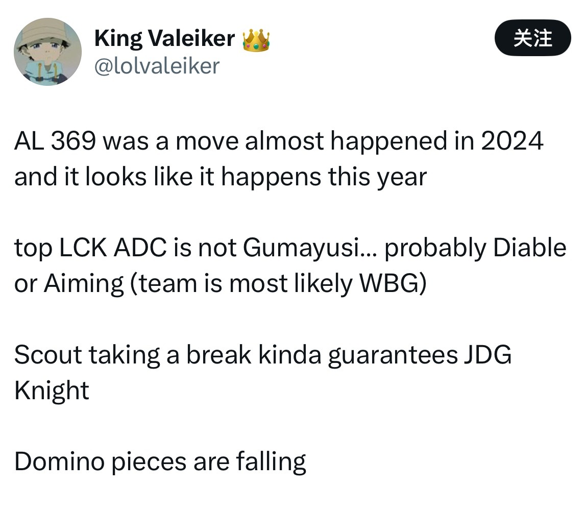外网🍉:AL 369在2024年就有想法,今年应该是实施了。(此前提到要来LPL的另外一位顶级ADC)有可能是Diable或者Aimingcr.lolvaleiker