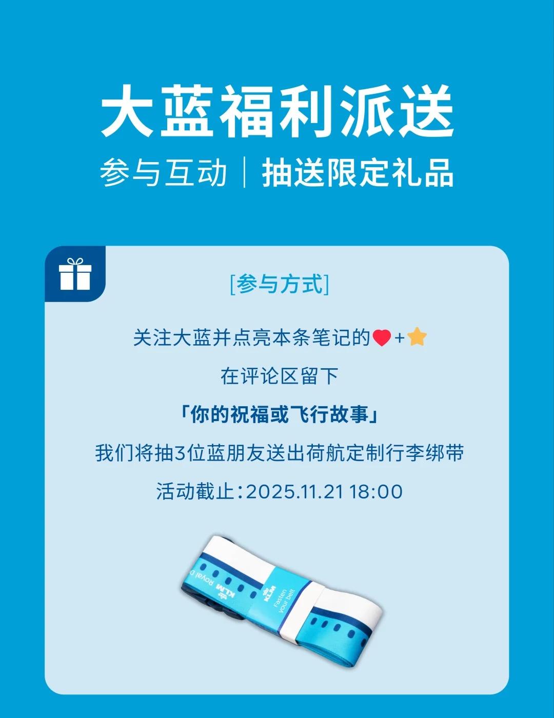 🎁我们又双叒获奖啦!进来一起庆祝吧🎉 🏆荷兰皇家航空获得APEX「五星级航空公司」认证,这份喜悦,必须和每一位蓝朋友分享!大蓝福利派送 ✨这个荣誉源自全球超百万旅客的真实评分——即便评选标准逐年严格,我们仍以五星满分的优势,稳居APEX全球评分最高7%的顶尖航空公司之列。 💙从高标准的暖心服务,到匠心呈现的「荷」式餐食,以及让飞行更舒适的客舱环境,我们始终相信:每一次飞行,都值得被用心对待。 🎉大蓝邀请你一起庆祝: 点亮❤️+⭐️,并在评论区留下你的祝福或飞行故事,我们将抽3位蓝朋友各送出「荷航定制款行李绑带」1件,愿它陪伴你解锁更多精彩旅程✈️ ⏰参与截止:2025年11月21日 18:00(准时蹲守哦~) 宠粉福利 免费抽奖 荷兰皇家航空 荷航 KLM APEX世界级航空公司