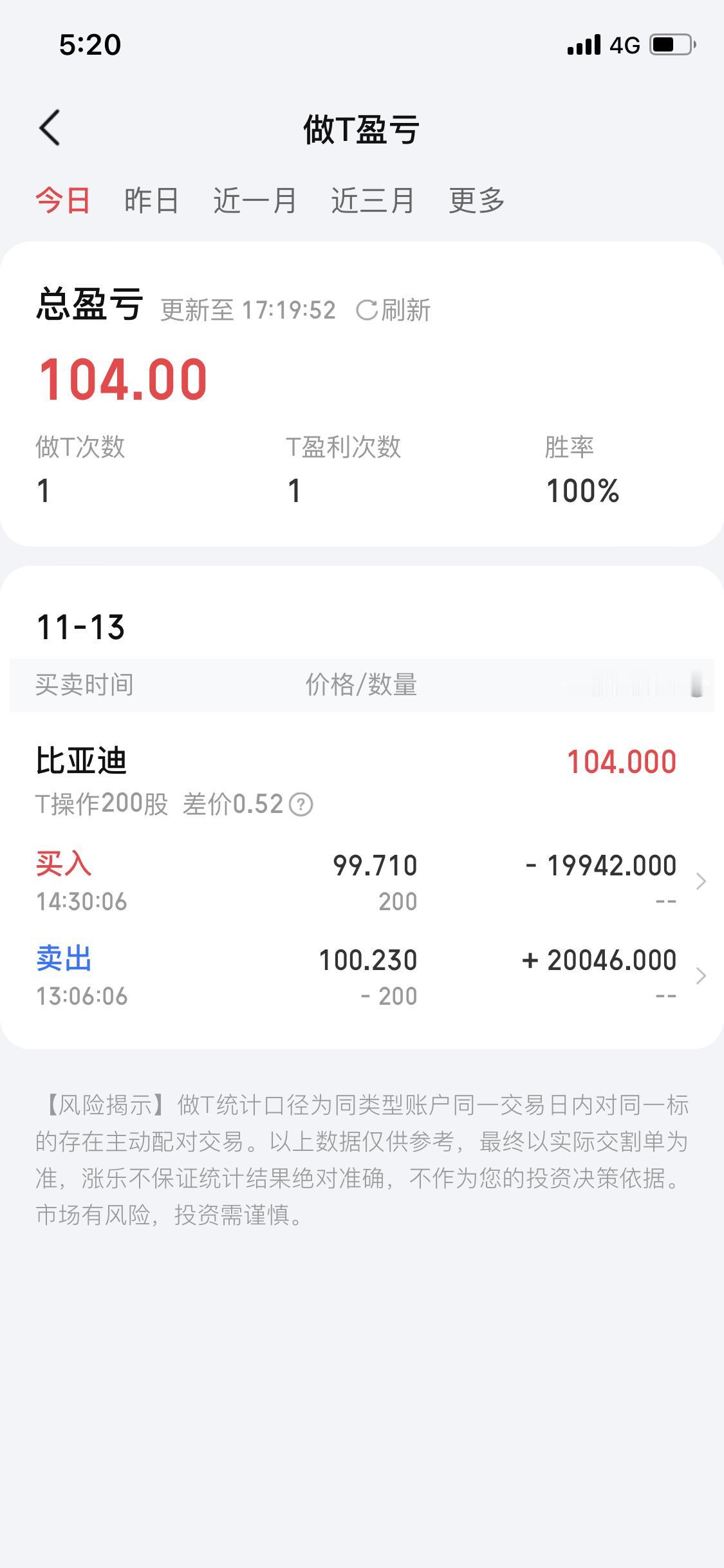 今儿心情超爽,在比亚迪股票上做T赚了100块!虽然这钱不算多,但操作成功的成就感可太足了。 想起有人88元买比亚迪,不到1个月90多卖,结果后来涨到416,简直错过一个“亿”。我这小赚一笔,也算是小试牛刀。比亚迪作为新能源汽车龙头,从13涨到416有近40倍涨幅,潜力巨大。就像在股海里抓到了一条“小鱼”,这100块是个好开头,说不定以后能有更大收获,继续在股市里冲冲冲!