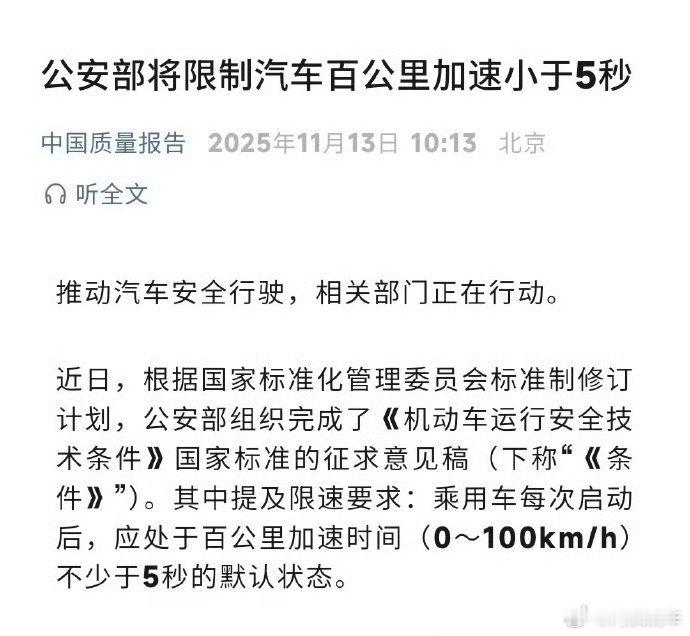 公安部将限制汽车百公里加速小于5秒怎么说呢,开车的主体依旧是人,因为安全就降低汽车性能,这对于喜欢玩车的朋友有点不太友好。那这是不是就意味着,后续车企关于百公里的宣传将迎来前所未有的改变?