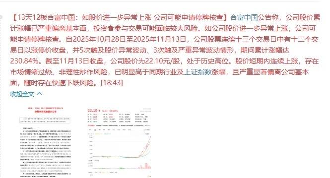 妖股合富中国预期中的利空来了!13天12板合富中国:如股价进一步异常上涨, 公司可能申请停牌核查。这个预期利空比预期来的晚的多,之前连板到6板,卡移动,7板,8板就会发预停牌公告,显然市场一直等这个,只要一天不出,就是没有利空就是利好。最近高标妖股炒作,不仅是炒名字,炒生肖,炒马字头,龙头,现在炒数字。今天妖股高潮高潮,合富中国缩量加速,本来就是随时派发大面,这个消息,促使明天高标集体大分歧,就是没有利空也是大分歧,高潮次日大分歧,不接力。高标明天如果集体大面,连板高标出来的资金,回去轮动趋势高标,高低切轮动,注意这个节奏。