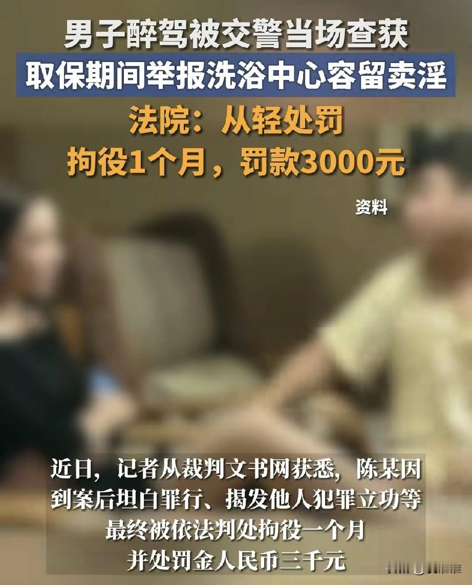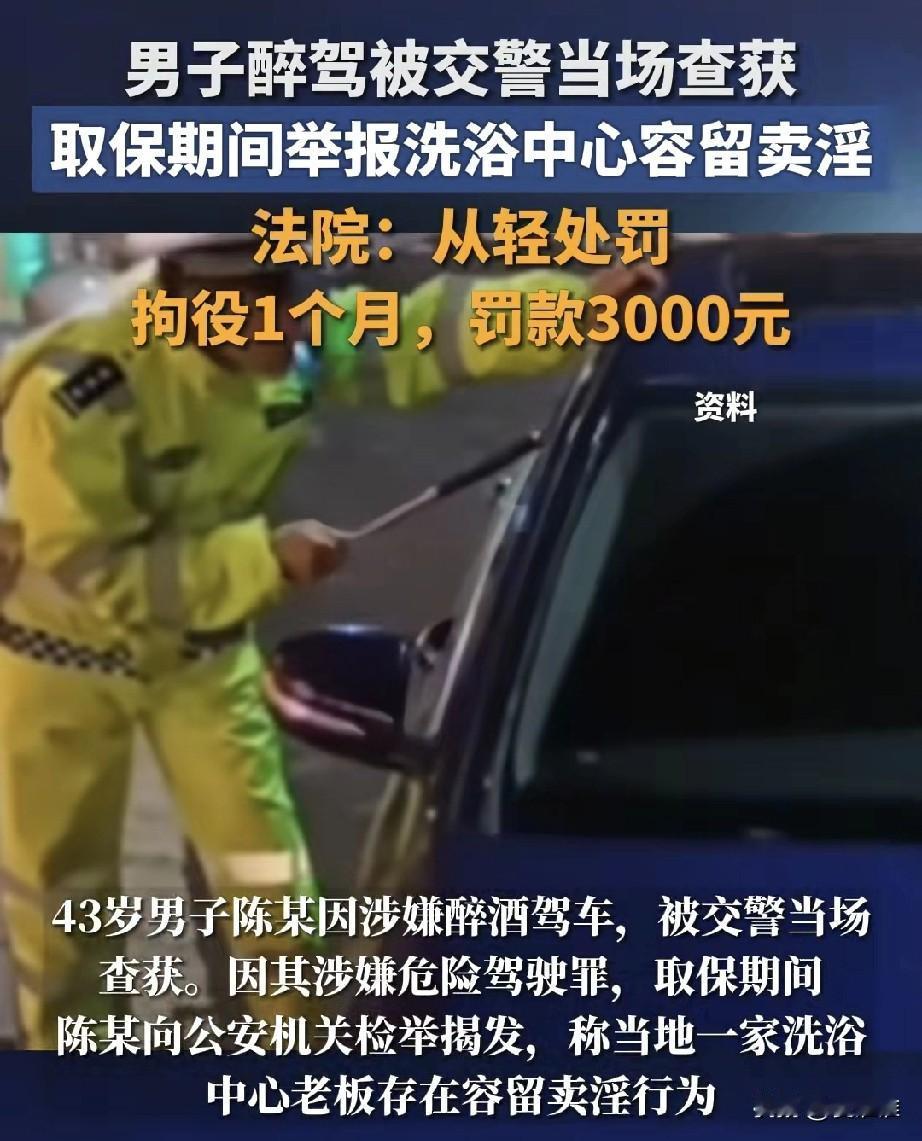 48岁男子心存侥幸酒后驾驶,被交警抓获后,在等待判决的取保候审期间,他举报当地一家洗浴中心存在色情服务,民警查获这家洗浴中心后认定男子的举报属实,有立功表现,在随后的判决中法官综合考虑了他的立功情节,判处他因醉酒驾驶机动车辆,拘役一个月,罚款3000元! 哈哈,网友评论:“这哥们不地道啊!”