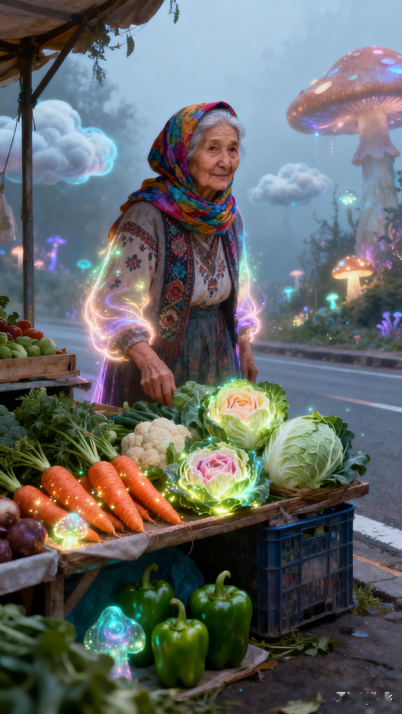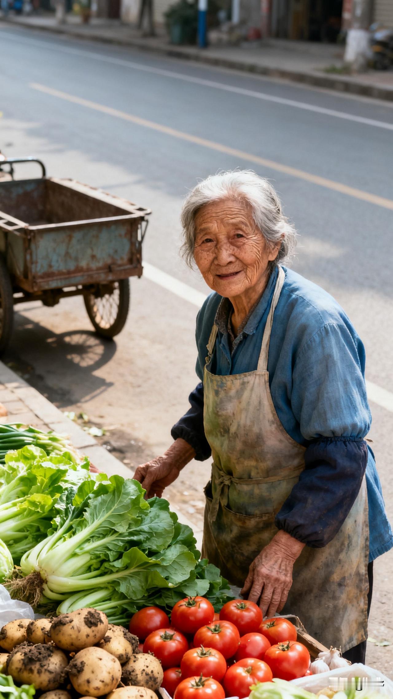 路灯刚亮起时,我看见了那位蜷在路边的老人。 三轮车斗里,三岁的孙子在她怀中睡得正沉,小脸紧贴着她单薄的胸膛。她一手揽着孩子,另一只手颤巍巍地给顾客称花生。地瓜上还沾着泥土,青菜在晚风里微微蔫了。 “儿子在外打工,孩子妈走了……”她声音很轻,像怕惊醒怀里的梦。 天色彻底暗了下来。篮子里的花生所剩无几,剩下的青菜也不多了。 “这些,剩下的我全要了。” 我递过远多于菜价的钱,她执意不肯多收,但我必须做到。 看着她用外套裹紧孙子,发动那辆吱呀作响的三轮车消失在夜色里,我拎着沉甸甸的塑料袋站在路边——里面装的,分明是一个老人全部的尊严和坚韧。 路灯把我们拉长的影子投在地上,那么轻,又那么重。 路边的老人家 路遇老太