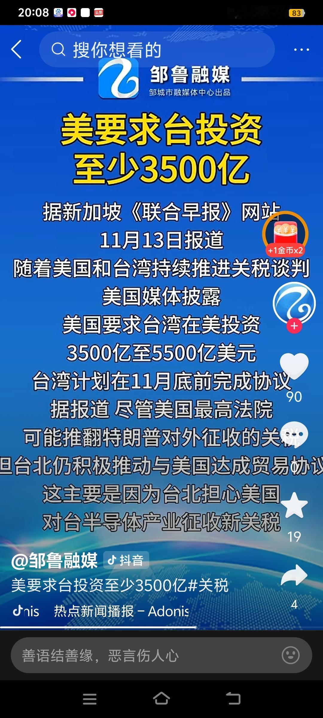 在美国和中国台湾的关税谈判中,美国要求中国台湾至少对美国投资3500亿美元,看来美国正在加快掏空台湾的腰包,准备放弃台湾这颗弃子了。 美国一直以来以各种理由不断地找台湾要真金白银,还对台湾输美产品征收高达32%的关税,现在在关税谈判中,又找台湾要最少3500亿美元的巨款,结合美国逼台湾将科技公司台积电核心产能迁到美国的情况,估计美国现在就是想掏空台湾的腰包,为美国将来的弃台行为作准备。 随着中国大陆军事实力的不断提升,美国已深感无力阻止中国人民解放军武力统一台湾,与其冒着打不赢的战争风险,不如趁早掏空台湾的腰包,到时候还卖个人情给中国,不干涉中国统一台湾的事。 前几天日本首相高市早苗,为了讨好美国,故意发表涉台不当言论,但美国总统特朗普根本不给高市早苗站台,因为美国现在只想快点掏空台湾腰包,好放弃台湾这个弃子了。