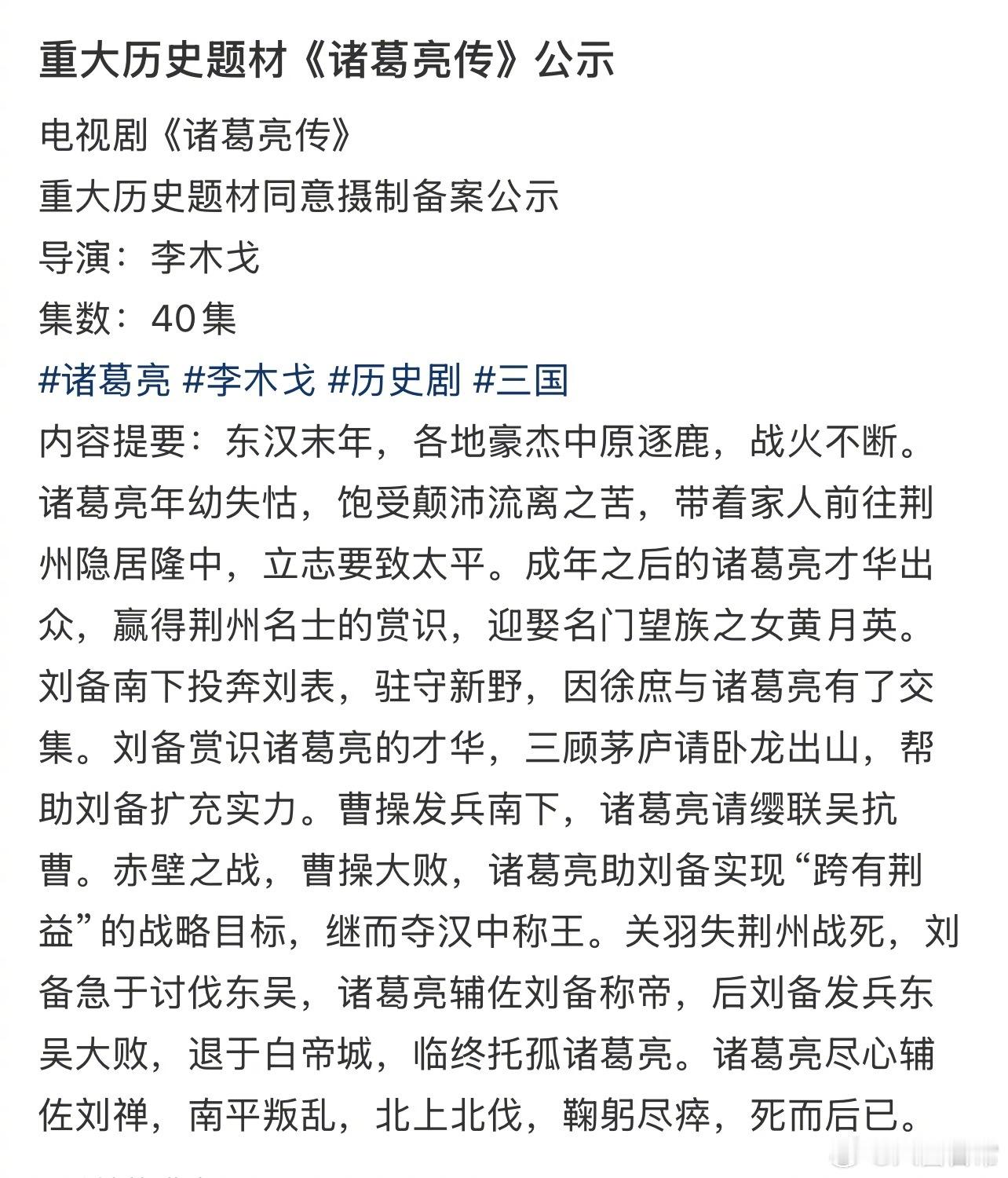李木戈要拍《诸葛亮传》,讲述诸葛亮的一生
