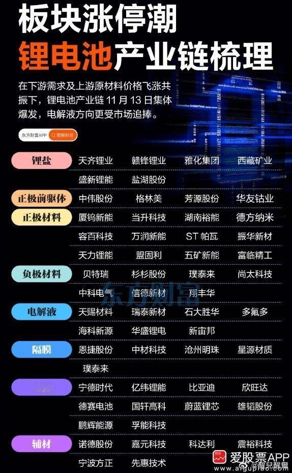 【上游原材料价格飞涨、下游需求旺盛!锂电产业链满屏涨停】锂电池概念11月13日掀起涨停潮,当天收盘时,富祥药业、康鹏科技、海科新源、华盛锂电、泰和科技等27股涨停。天宏锂电、天华新能等12股则大涨超10%。综合市场观点来看,下游需求旺盛及上游产能供给不足导致部分原材料价格飞涨,是近期锂电池板块强势的核心因素。 上游来看,六氟磷酸锂、VC(碳酸亚乙烯...