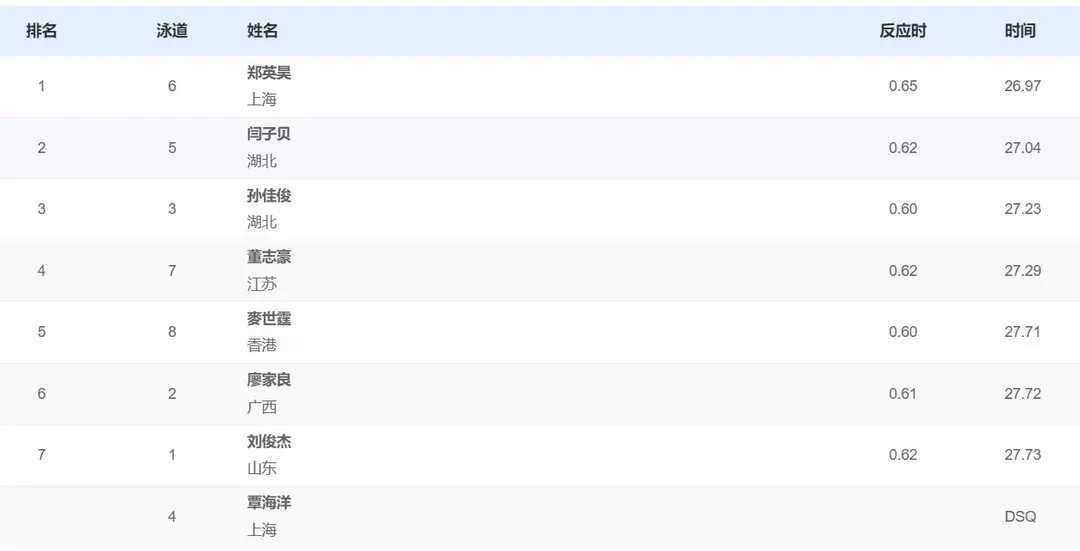 全运男50米蛙泳爆冷!覃海洋犯规失成绩郑英昊26秒97夺金11月13日晚,第