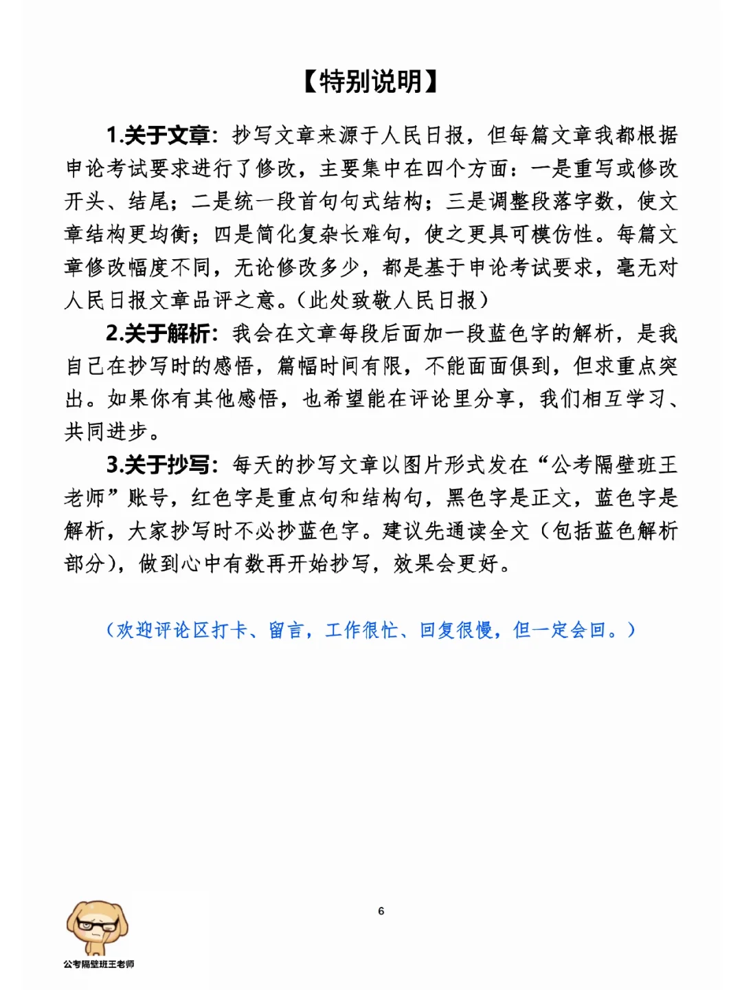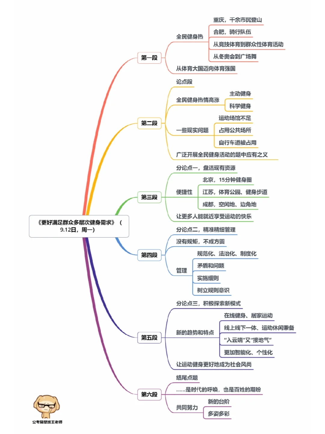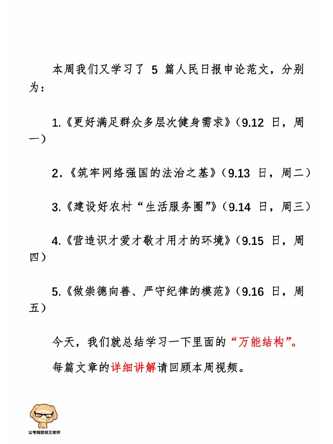 本周我们又学习了5篇人民日报申论范文,分别为: 1.《更好满足群众多层次健身需求》(9.12日,周一) 2.《筑牢网络强国的法治之基》(9.13日,周二) 3.《建设好农村“生活服务圈”》(9.14日,周三) 4.《营造识才爱才敬才用才的环境》(9.15日,周四) 5.《做崇德向善、严守纪律的模范》(9.16日,周五) 今天,我们就总结学习一下里面的“万能结构”。 每篇文章的详细讲解请回顾本周视频。 ⭐️⭐️⭐️⭐️⭐️⭐️ 这里是公考隔壁班王老师独创的“每天半小时・申论80分”抄写团,欢迎加入我们!