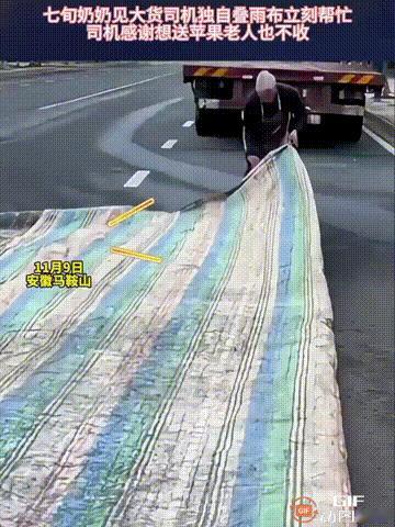 安徽马鞍山一位货车司机在路边叠雨布,由于雨布非常大,他一个人叠起来很不方便,只能慢慢地叠着,这时一个70多岁的老奶奶路过见状,连忙停下来帮忙,她和司机一人站在一边,很快就将雨布叠好了,司机非常感谢老奶奶,想起车上还有一些苹果,就打算送一些给老奶奶品尝,谁料老奶奶婉拒了,她说“孩子不用了,你跑车那么辛苦,还上有老下有小的,赶紧回家吧”,司机听完后特别地感动,他表示老奶奶就像一位天使一样,突然就出现过来帮自己了,自己是一位退伍军人,希望能够传递老奶奶的善意,网友看完这段视频,都觉得这样的老人真是太值得被尊重了,这位老奶奶已经70多岁了,可以说她活得非常透彻,不仅具有乐于助人的美德,还有着做好事不求回报的品质,更暖心的是她对司机说的话,完全像是一个敬爱的长辈对后辈真心的关怀,那份情感特别的真诚,相信她的善举会温暖司机一辈子,同时也会将这份善意传递下去,这才是最好的正能量。大家怎么看呢?