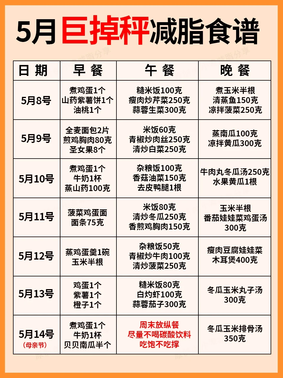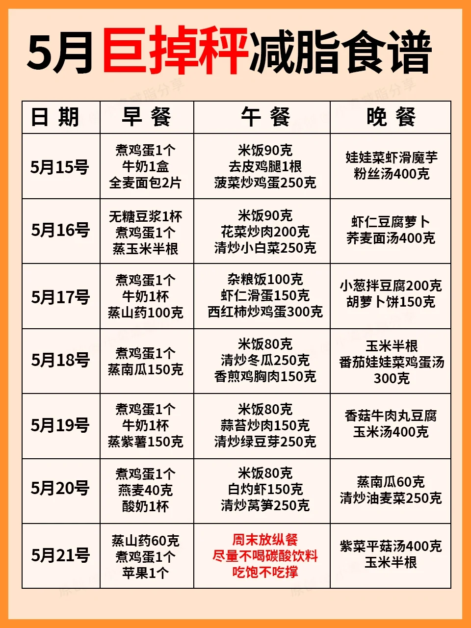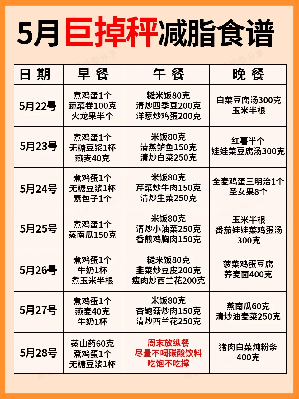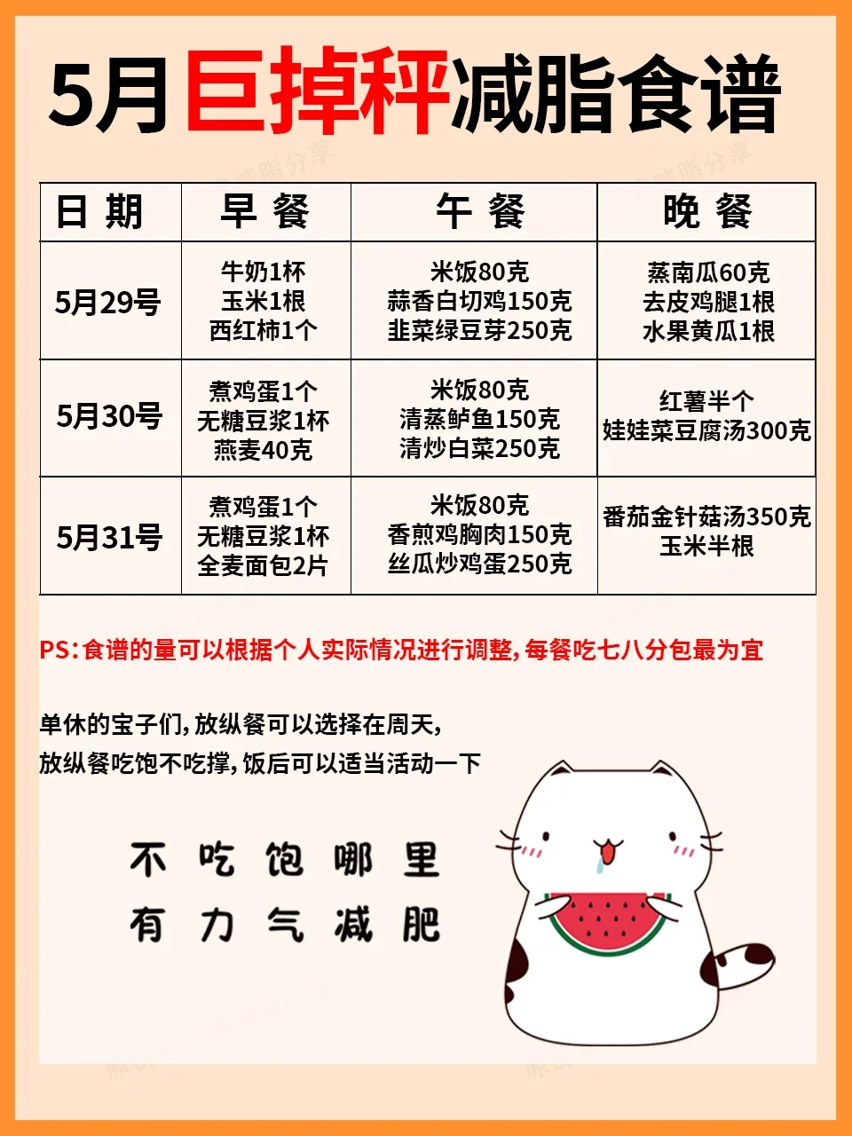一份好的饮食计划是你成功减脂的关键!5⃣月份减脂食谱送上🥰,吃瘦不饿瘦👊 5月不✂️🥩,夏天就真的要跟小裙子无缘了‼️‼️ 不爱运动但又渴望好身材的宝子们,赶紧跟着吃起来,身材好了你就是行走的衣服架子,这个夏天小裙子随便你挑,心动不心动呀💓💓💓 每一餐都是营养均衡的,很多肥胖都是因为身体内营养不均衡导致的,所以跟着食谱吃,吃出健康吃出好身材💯💯