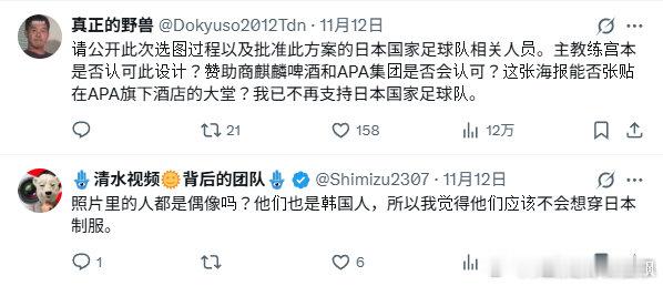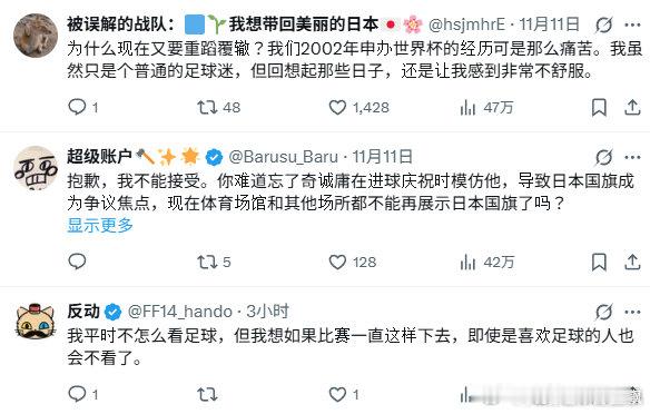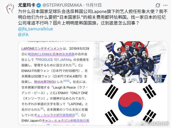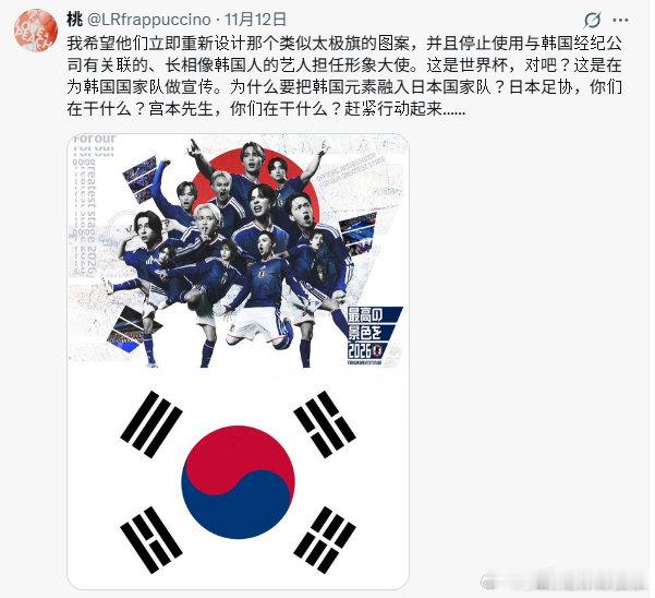 今天刚吃的瓜,日本球迷因为国家队宣传海报闹起来了原因是日本足协请了偶像艺人作为国家队宣传大使,但海报中的日本国旗被装饰得很像韩国太极旗……海报中心原本是日本国旗,但加上三道杠元素,而且摆放位置很微妙,就……有点韩。日本球迷就不愿意了,评论区基本都是喷的,县议员也表态应该慎重,截几个大家看看三天过去了,日本足协并没有回应球迷的呼吁重做海报 cr:英国足球那点事