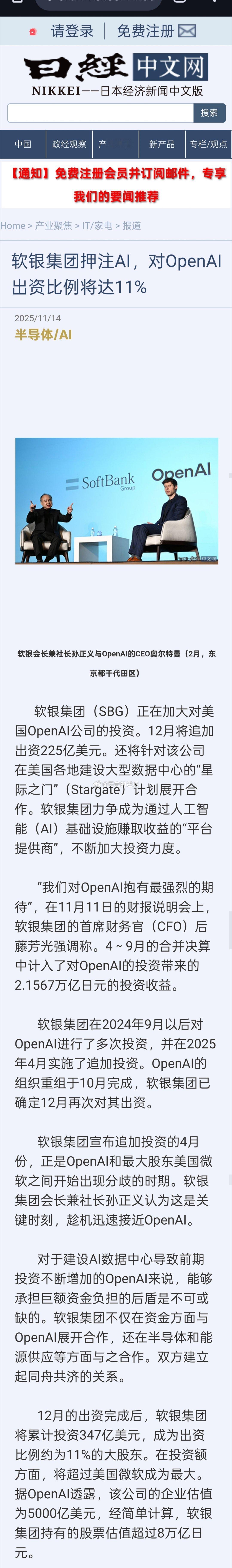 软银集团正在加大对美国OpenAI公司的投资。12月将追加出资225亿美元。还将针对该公司在美国各地建设大型数据中心的“星际之门”计划展开合作。软银集团力争成为通过人工智能基础设施赚取收益的“平台提供商”,不断加大投资力度。  “我们对OpenAI抱有最强烈的期待”,在11月11日的财报说明会上,软银集团的首席财务官(CFO)后藤芳光强调称。4~9月的合并决算中计入了对OpenAI的投资带来的2.1567万亿日元的投资收益。路透社10月报道称,OpenAI正在为首次公开募股(IPO)做准备。有分析认为,该公司估值将达到1万亿美元,软银集团持有的OpenAI股票估值有进一步增加的空间。