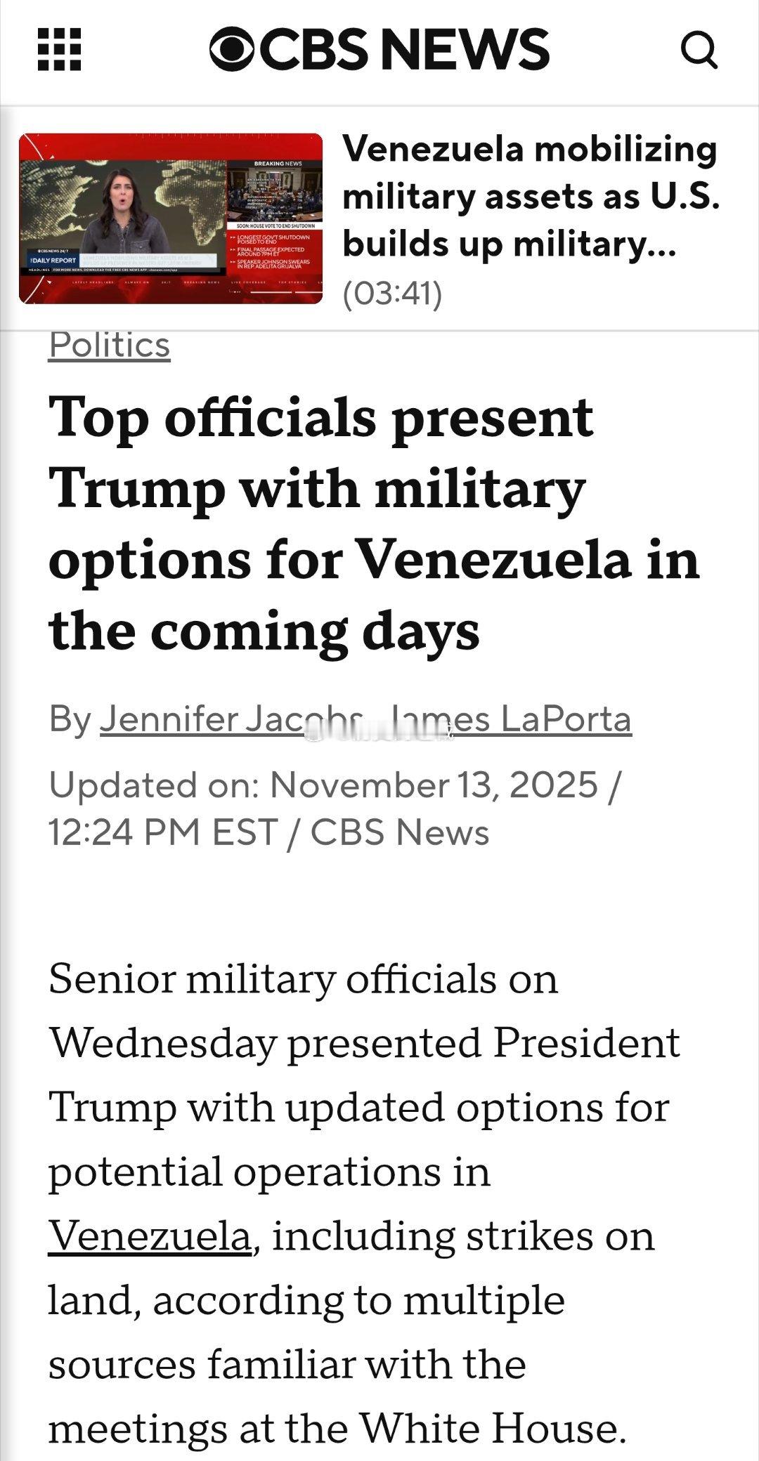 CBS新闻报道,美国总统特朗普已听取军方高层关于对委内瑞拉可能采取军事行动的最新简报。国防部长赫格塞斯、参联会主席凯恩等高级军官在白宫会议上向特朗普提交了多套行动方案,其中包括地面打击计划。目前尚未做出最终决定,但美国情报部门也参与了行动情报准备。