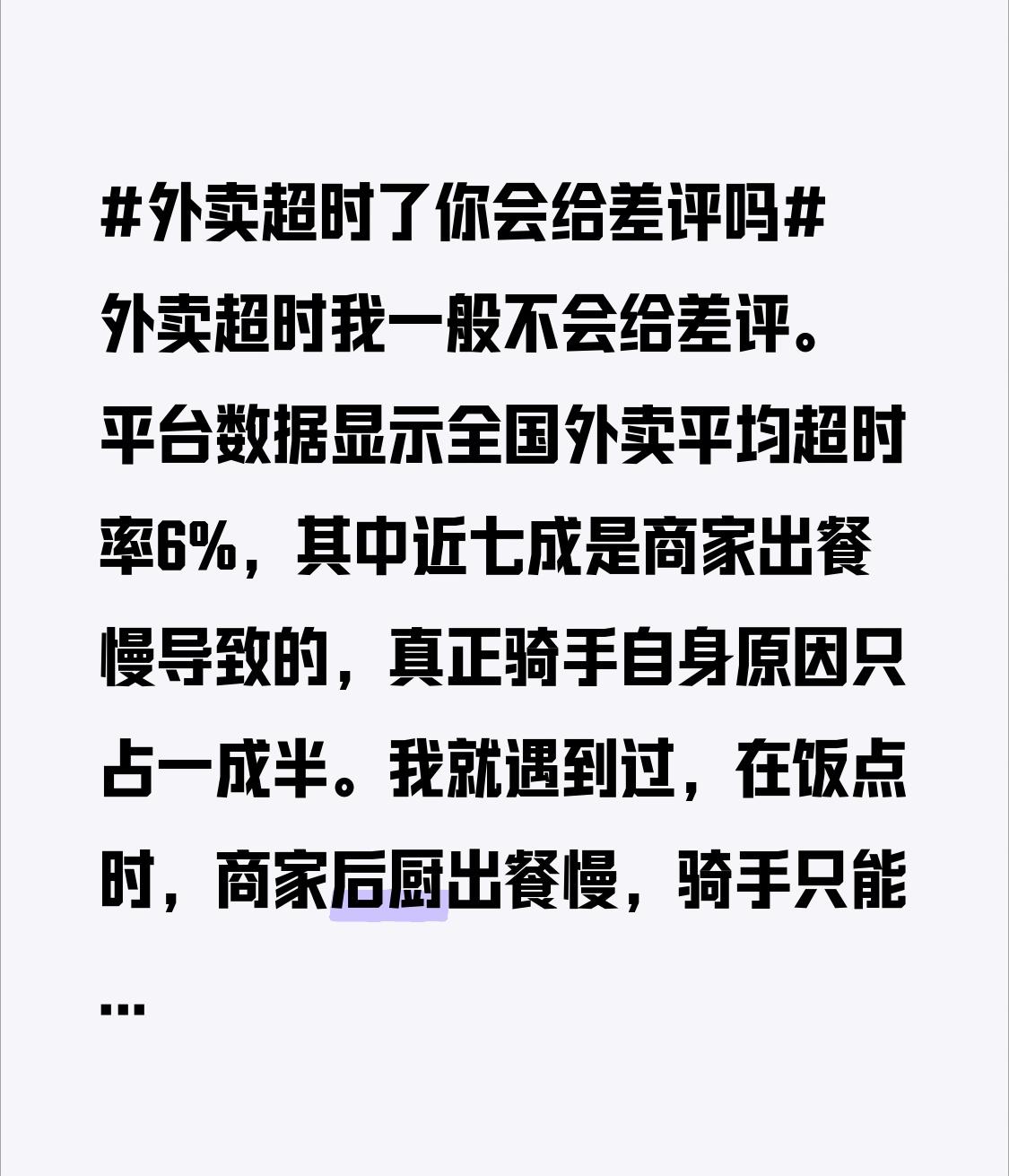 外卖超时我一般不会给差评。平台数据显示全国外卖平均超时率6%,其中近七成是商家出餐慢导致的,真正骑手自身原因只占一成半。我就遇到过,在饭点时,商家后厨出餐慢,骑手只能干等着,可系统却提示骑手已迟到。 而且天气也会影响配送时间,暴雨红色预警时,超时率能冲到23% ,但大部分人都能体谅。一个差评对骑手影响很大,专送骑手被扣1分,相当于12单白干;众包骑手评分低了单量会腰斩。也许他们只是遇到了突发状况,没必要因为这一点让他们承受巨大损失。