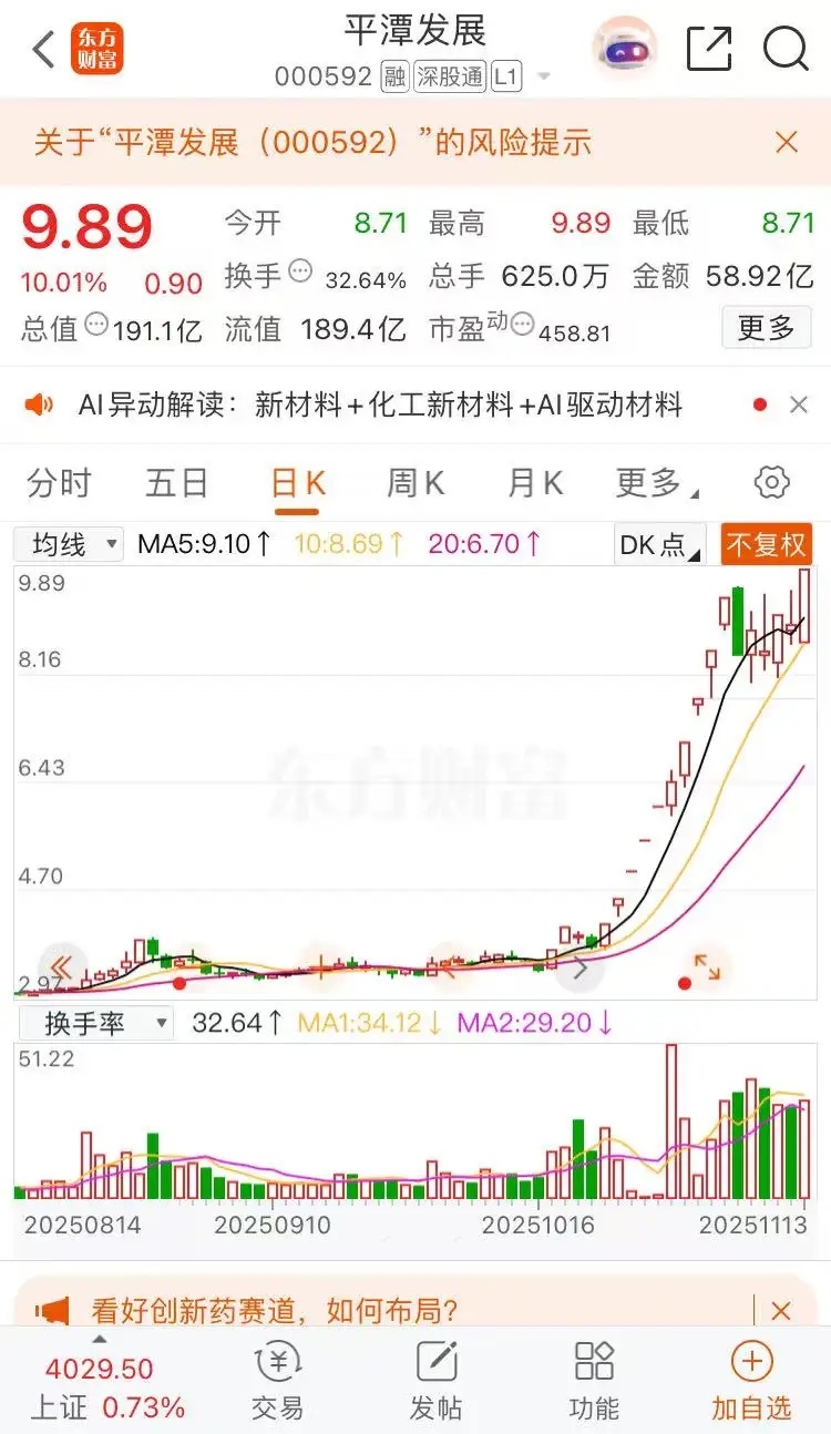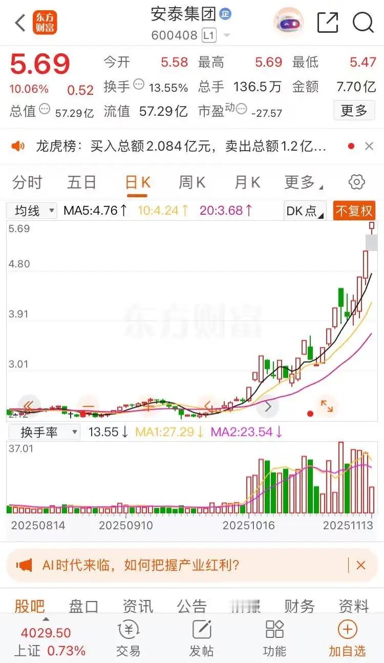 三足鼎立安泰集团,合富中国,平潭发展。安泰集团涨停板收盘报收5.69元每股,成交金额7.70亿元,缩量涨停板,21天12个涨停板。一个字强。平潭发展涨停板收盘报收9.89元每股,成交金额58.92亿元,创出近期新高,20天12个涨停板,两个字,很强。合富中国涨停板收盘报收22.10元每股。成交金额10.52亿元,13天12个涨停板,三个字,非常强,不愧是跨年妖股。沪指指数也已经创十年新高,把握节奏