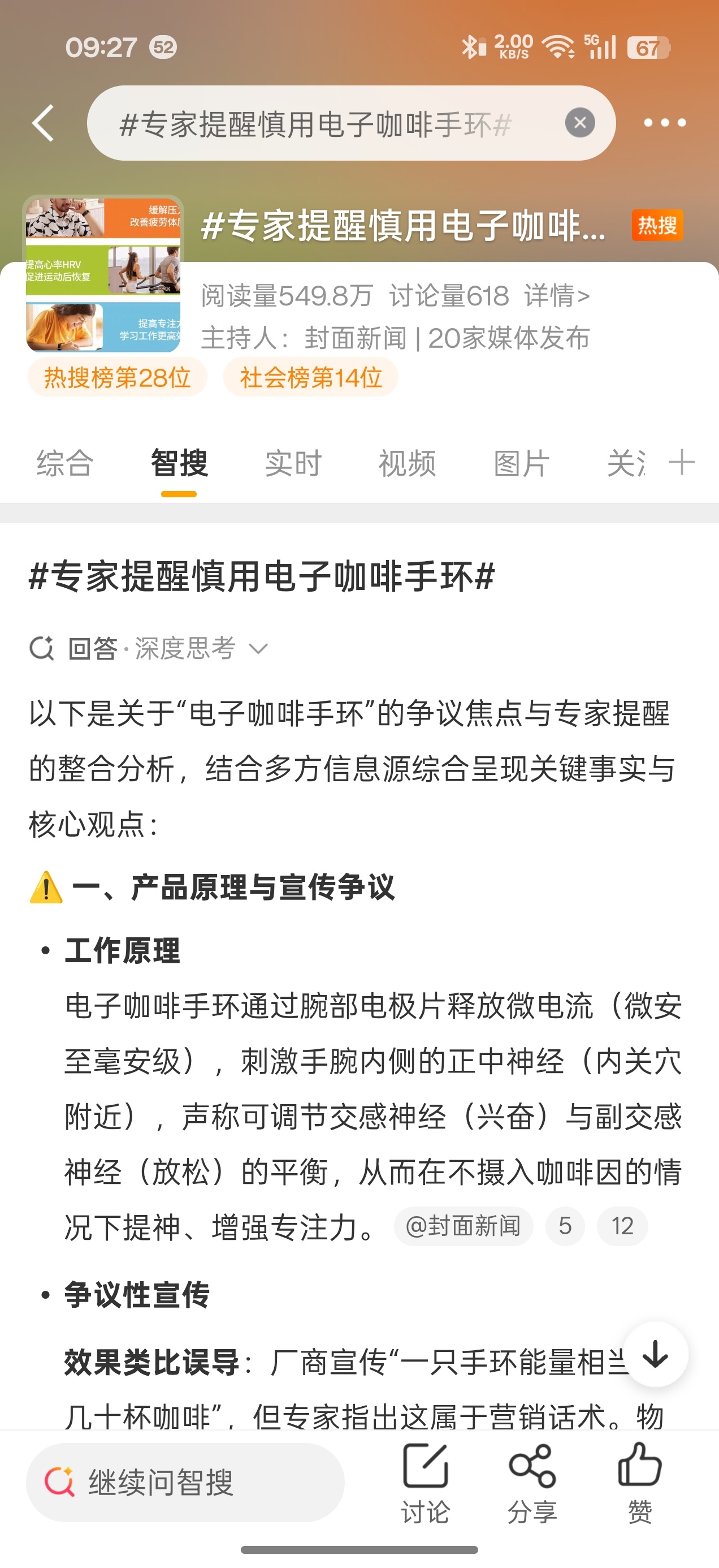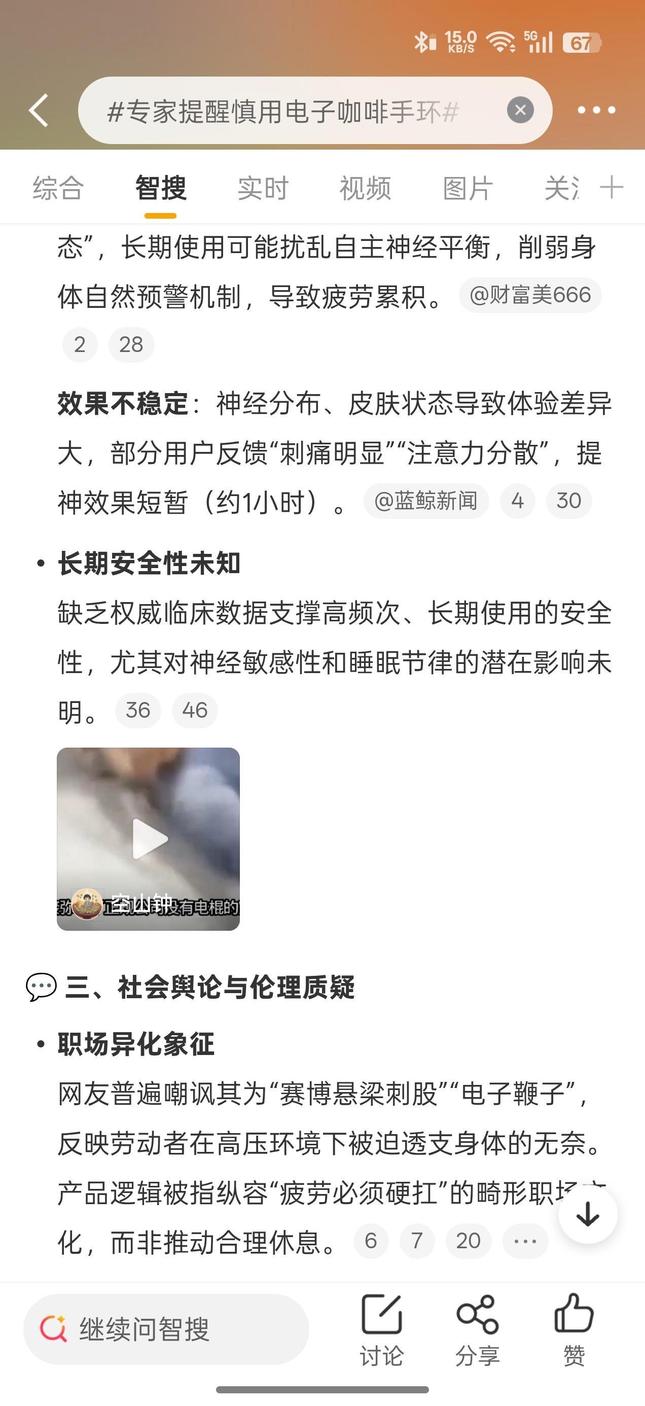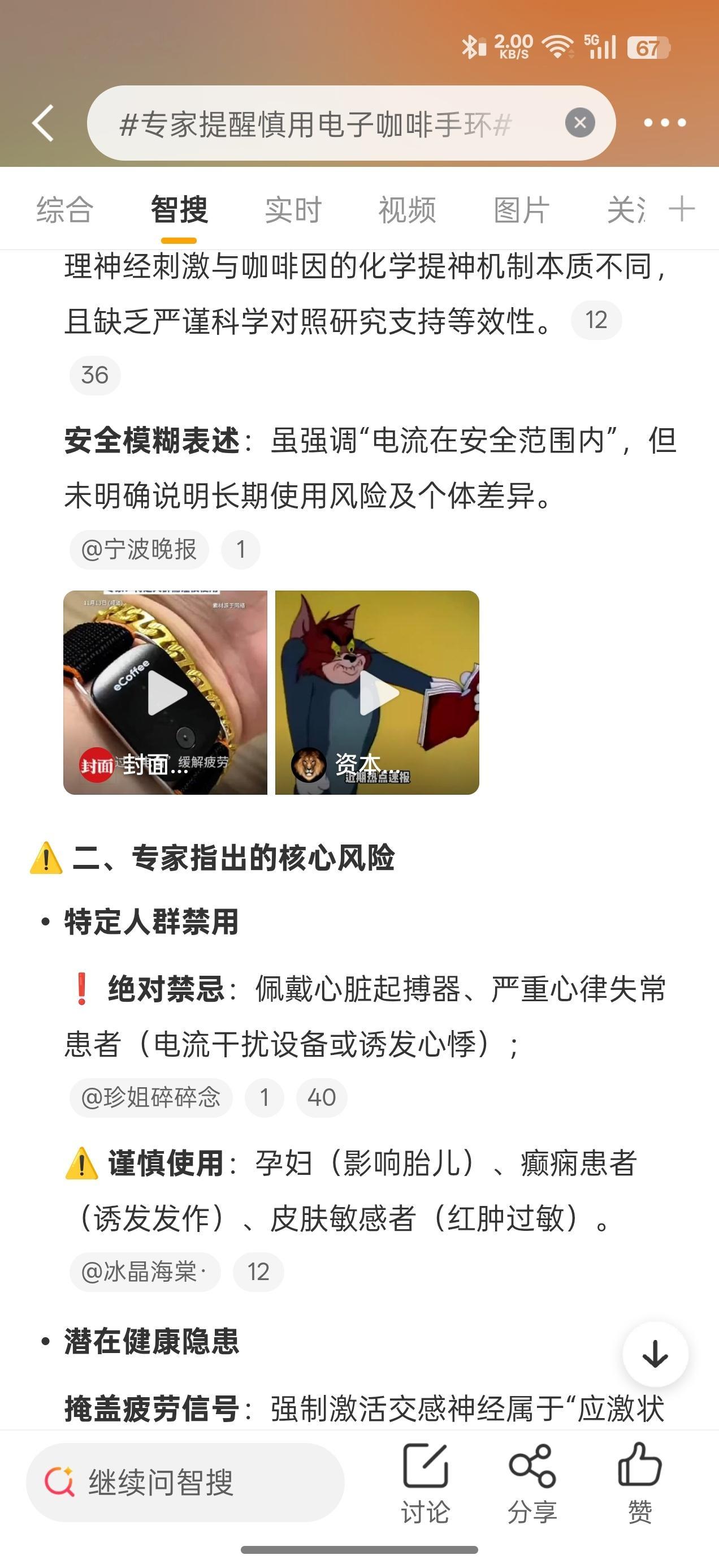要不是看到热搜上专家提醒慎用电子咖啡手环,还真不知道有这个东西……这东西也太反人类了吧,困了累了不休息,用它?极度疲倦的情况下喝咖啡提神本来就已经很迫不得已了,不提倡,更何况是用什么电子咖啡手环。。很难评。很多人说智商税,我觉得如果是纯智商税那可能还好,就怕它真的有效果。。有效果的话你不知道会不会带来什么未知的风险和副作用。只能说,这种东西的出现,真的太颠了……
