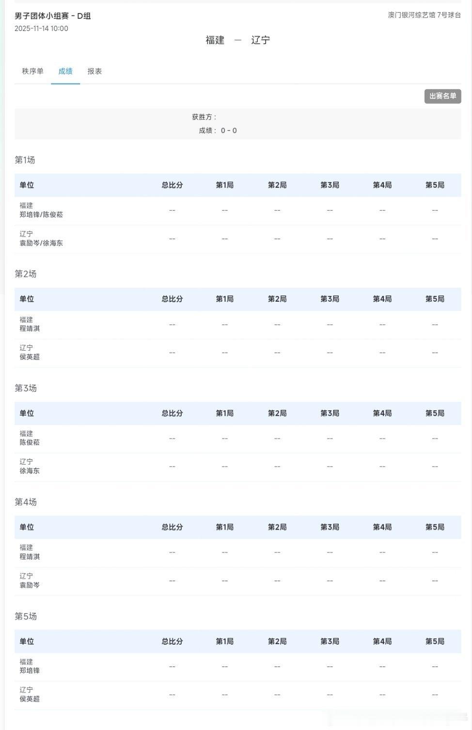 2025年第十五届全运会男团小组赛对阵表:上海队VS江苏队 A组 T1周恺许昕VS曹彦涛陈亚轩樊振东VS孙闻许昕VS陈亚轩樊振东VS曹彦涛周恺VS孙闻福建队VS辽宁队 D组 T7郑培锋陈俊菘VS袁励岑徐海东程靖淇VS侯英超陈俊菘VS徐海东程靖淇VS袁励岑郑培锋VS侯英超
