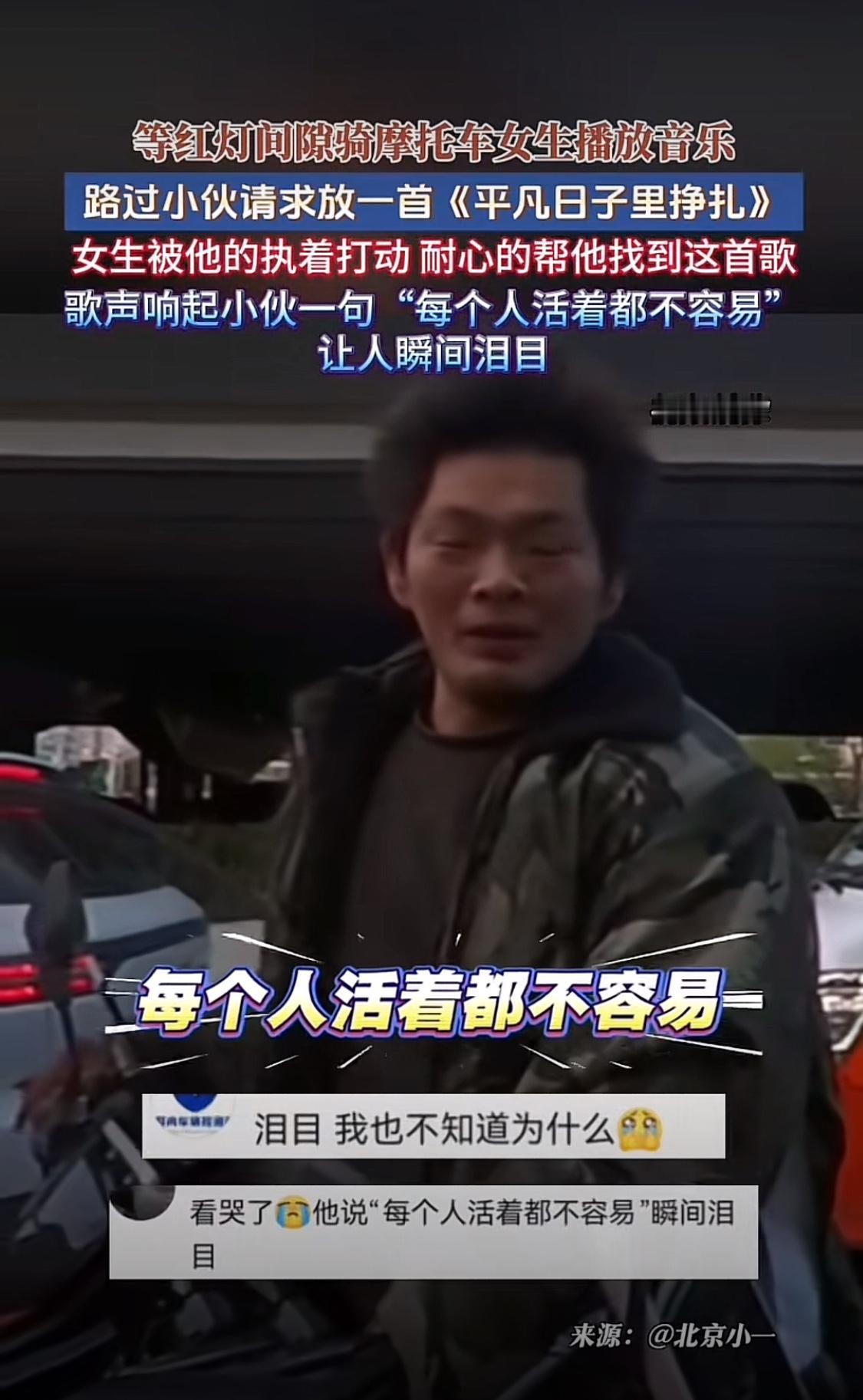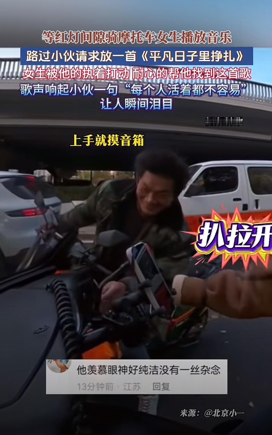 每个人活着都不容易! 晚高峰的红绿灯路口,在等红灯间隙,一位电摩小哥注意到旁边带音响的小摩托,便与摩托小姐姐搭讪说,这音响音质肯定好,随即便询问能否播放一首《平凡日子里的挣扎》,小姐姐被对方的执着打动,摘下手套搜索歌曲,随着音乐旋律响起,电摩小哥瞬间动情,眼眶湿润,连说两句,每个人活着都不容易。 像是对着小姐姐说,又像是对着老天说。此时绿灯亮起,小哥也起步驶离。这才注意到,他的衣服已经破了洞,脚上也没有穿袜子。 这一幕感动无数网友,在社会底层挣扎的人们,倾尽所能也只混个温饱,心中的苦闷无处宣泄,只能向老天叹一句,每个人活着都不容易!