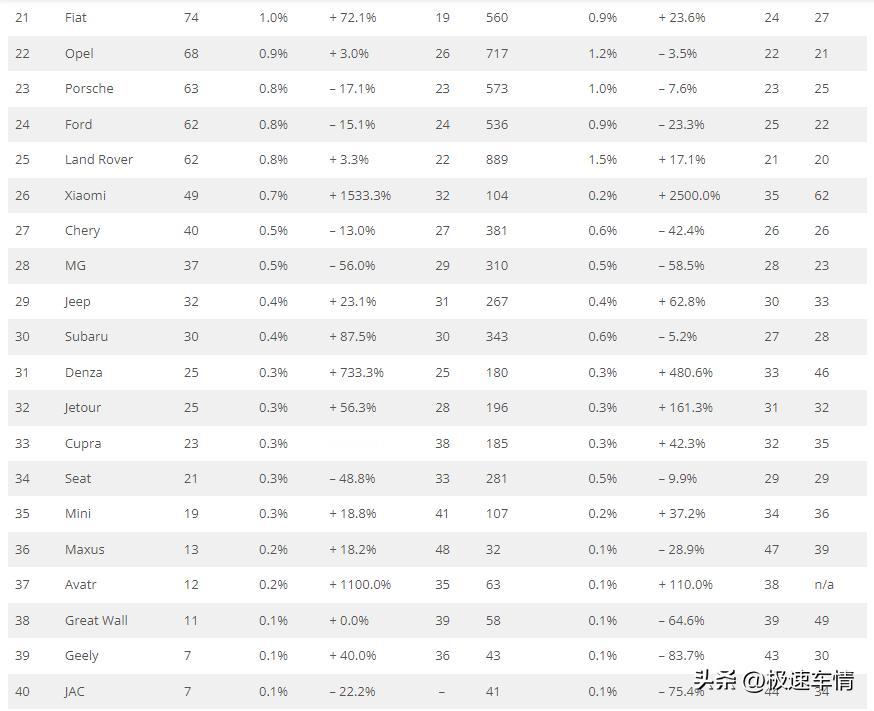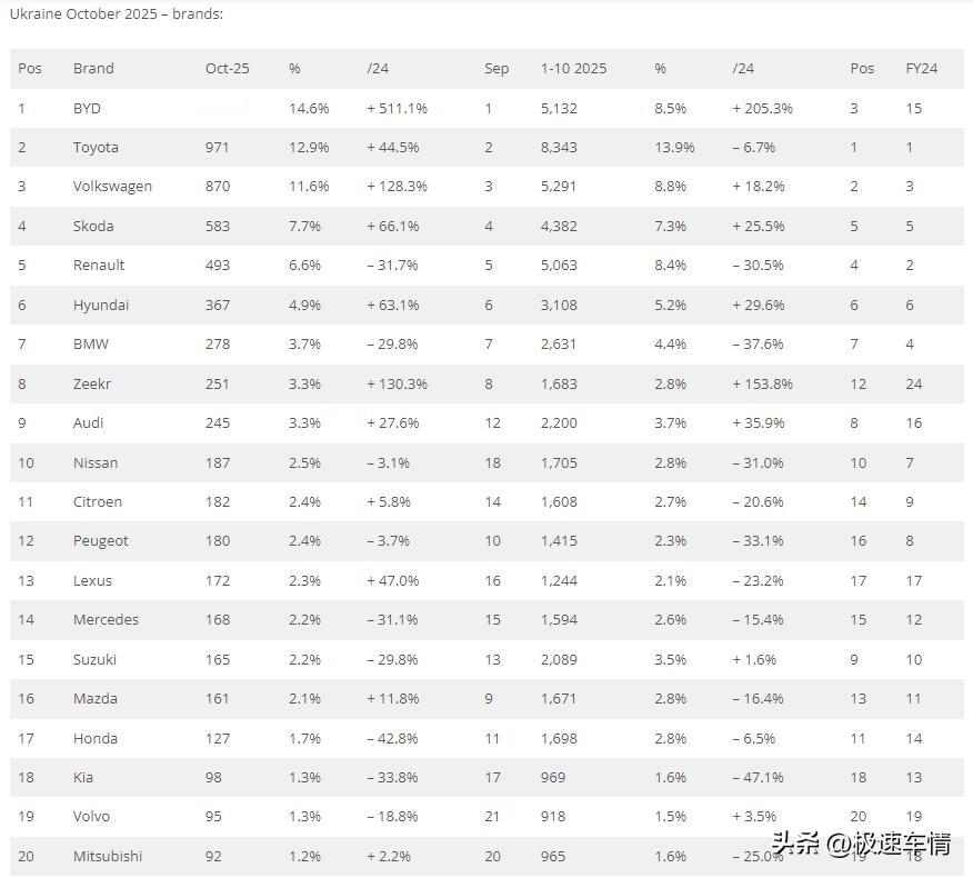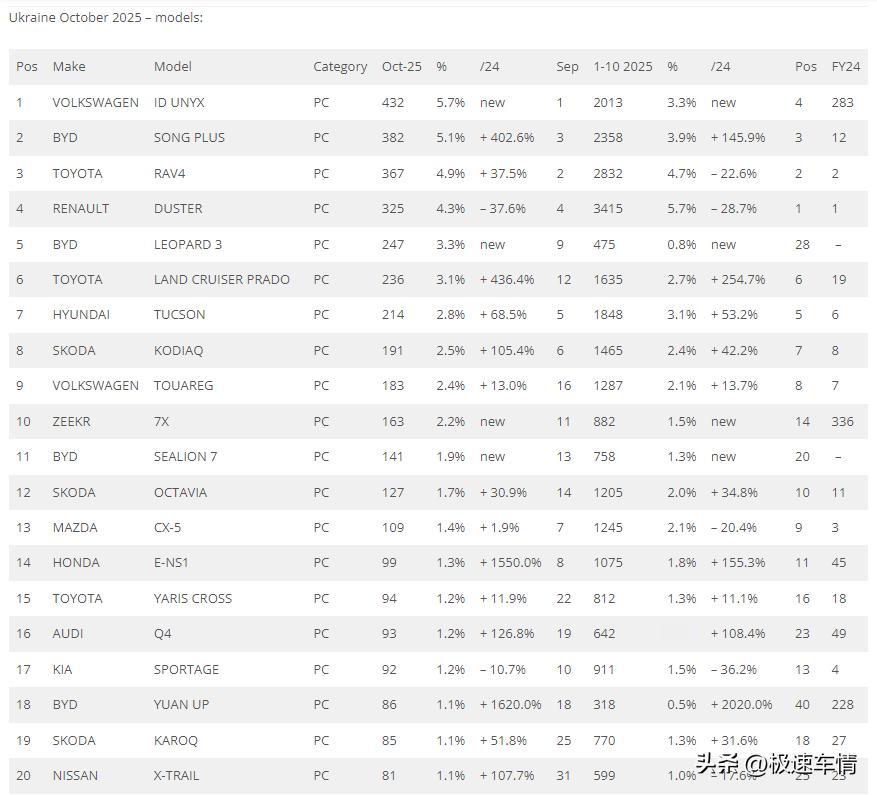 十月,乌克兰车市在继续恢复统计后,迎来同比大涨。以比亚迪、极氪为代表的中国品牌凭借新能源车型的高增长,成为拉动市场活力的关键力量,且多款车型成功跻身主流榜单。中国品牌的认可度持续提升中。 2025年10月,乌克兰新车销量同比增长28%,至7,525辆。 2025年1-10月,乌克兰累计销量同比下降3%,至60,228辆。市场复苏势头强劲。灰色进口车成为市场重要组成部分,多款热门车型依托该渠道实现高增长。 中国品牌表现: 比亚迪:1100辆,第1名,市占率14.6%。 极氪:251辆,再度创下纪录,稳居第8名,这也是该品牌全球范围内的最佳排名。市占率3.3%。 小米:49辆。小米以0.7%的份额位列第26名,其销量全部来自灰色进口车渠道。 奇瑞:40辆。 名爵:37辆。 腾势:25辆。 捷途:25辆。 阿维塔:12辆。 长城:11辆。 吉利:7辆。 江淮:7辆。