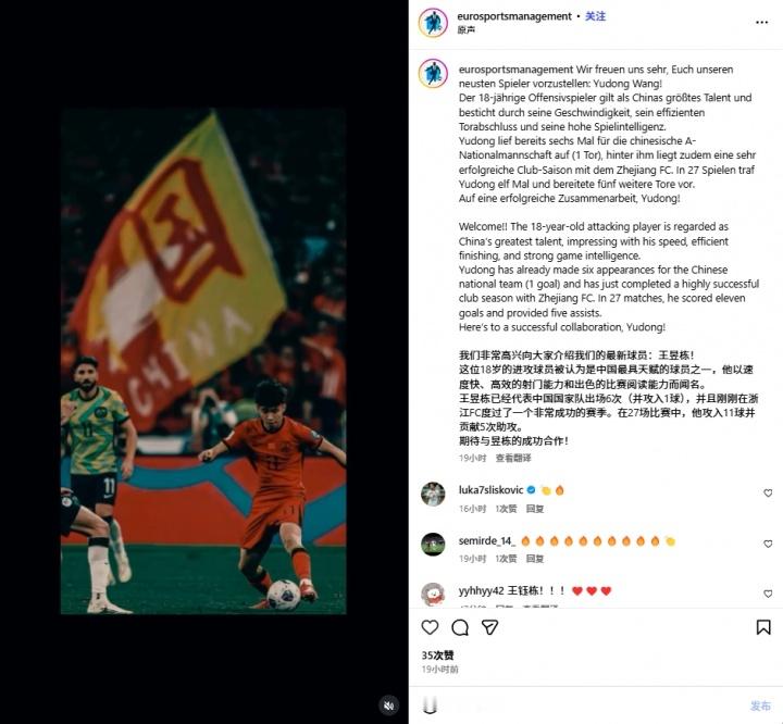 欧洲经纪公司Euro sports management宣布与王钰栋达成合作。公告:我们非常高兴向大家介绍我们的最新球员:王钰栋!这位18岁的进攻球员被认为是中国最具天赋的球员之一,他以速度快、高效的射门能力和出色的比赛阅读能力而闻名。王钰栋已经代表中国国家队出场6次(并攻入1球),并且刚刚在浙江队度过了一个非常成功的赛季。在27场比赛中,他攻入11球并贡献5次助攻。期待与钰栋的成功合作! 值得一提的是,该公司曾代理过莱万。