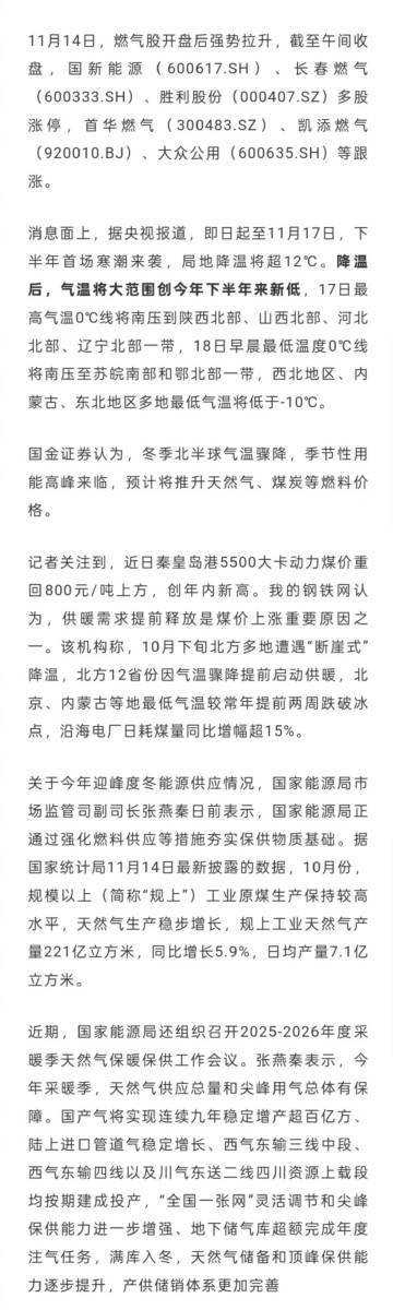 【】11月14日,燃气股开盘后强势拉升,截至午间收盘,国新能源、长春燃气、胜利股份多股涨停,首华燃气、凯添燃气、大众公用等跟涨。消息面上,据央视报道,即日起至11月17日,下半年首场寒潮来袭,局地降温将超12℃。降温后,气温将大范围创今年下半年来新低,17日最高气温0℃线将南压到陕西北部、山西北部、河北北部、辽宁北部一带,18日早晨最低温度0℃线将南压至苏皖南部和鄂北部一带,西北地区、内蒙古、东北地区多地最低气温将低于-10℃。