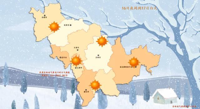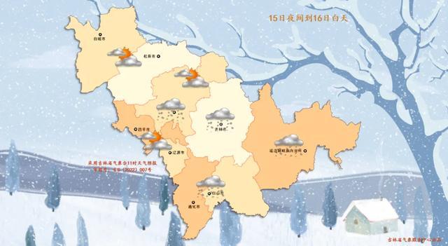 16日白天,长春东南部、四平东部、辽源、吉林市、通化、白山、延边州、长白山保护开发区有小雪或阵雪;16日夜间,白城、松原南部、长春东部、四平南部、辽源、吉林市、通化、白山、延边州西部、长白山保护开发区有小雪或阵雪。