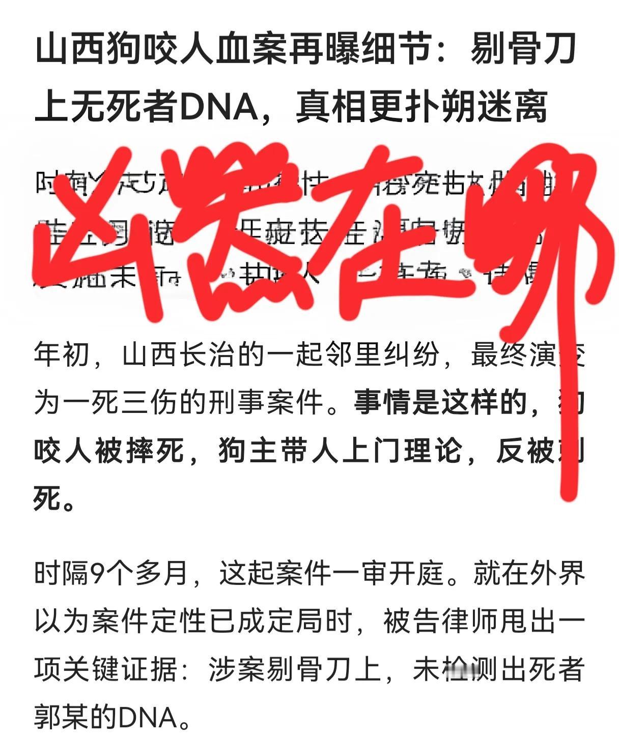 山西狗咬人被摔死,狗主人上门讨说法被反杀出现了诡异的现象,凶器上没有狗主人的DNA,那么问题来了,狗主人的刀伤谁整的?真正的凶手是谁?凶器去哪儿了? 进行合理的推断,狗主人的刀伤大概率来自友军,会不会来个案中案呢?真正的凶手会不会被揪出来?虽然是友军,但下的是死手呀!会不会被重判呢?