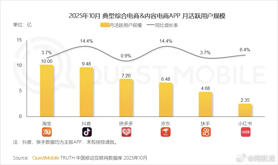 QuestMobile数据显示,2025年10月,淘宝、抖音、拼多多、京东、快手和小红书APP月活跃用户规模同比增速分别为3.7%、14.4%、0.9%、14.4%、3.7%、6.4%,规模分别达到10.00亿、9.48亿、7.20亿、6.48亿、4.68亿、2.35亿。