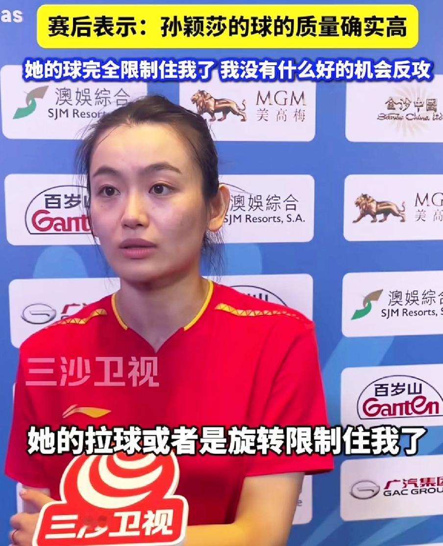 孙颖莎4:0女削球手刘斐, 没想到赛后采访刘斐这样评价孙颖莎。 全运会女单1/4决赛, 孙颖莎4:0削球手刘斐。 这个刘斐可是很厉害的, 第一轮4:0横扫香港一姐杜凯琹, 第二轮4:2国乒新星陈熠。 没想到跟孙颖莎打, 却被孙颖莎4:0横扫。 球迷们直呼, 打削球手还得是孙颖莎。 在赛后采访时, 刘斐也表示莎莎的质量很高, 不是她的主动失误, 而是正常的失误。 被莎莎的拉球或旋转完全限制住了, 根本没有什么机会去反攻。 一看刘斐就是实在的女孩, 对自己有很清晰的认识。 谦虚礼貌的人, 同样值得得到掌声。 (图片源自于网络)