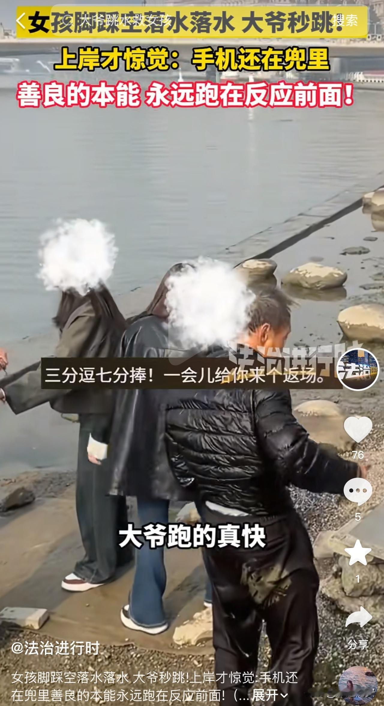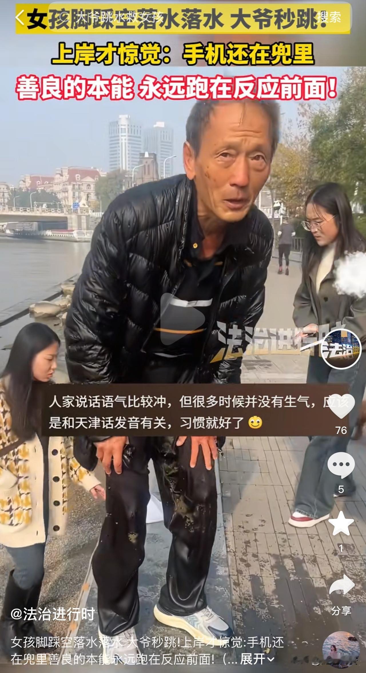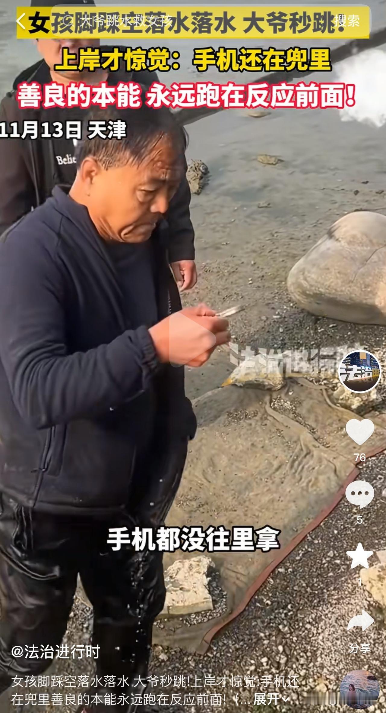 太感人了!天津,一女子在海河边不慎踩空落水,几名大爷直接跳进水里把人救上来,上岸后才发现,手机还在衣服兜里。 网友:善良的本能,永远跑在反应前边! 11月13日,一名女子在海河边拍照,由于石头岸边湿滑,她不慎跌落水中。 这时,两位天津大爷看到后,迅速跑了过来,都没有来得及脱下衣服,直接跳下冰冷的水中,推着女子就往岸上送,河边的另一个大爷拉着女子的手,大家齐心协力把女子救了上来。 救上岸后,女子对几位大爷表示感谢,其中一个大爷则让她赶紧上到安全的地方,免得再次落水。 这时,旁边的人询问大爷,你们的手机呢? 下水救人的两个大爷这才想起来,手机根本就没往外掏,他们从湿漉漉的衣兜里掏出,同样滴水的手机,估计大爷们的手机需要烘干后才能用。 通过视频来看,救人的大爷得有七十多岁了,还能奋不顾身下水救人,为他们点赞。 说实在话,大爷们这么下水特别危险。因为他们没热身,河水又冰凉刺骨,下去后容易抽筋,而且他们没脱鞋没脱衣服,在水里负重极大,但是大爷没有思考这些,善良的心驱使他们舍命救人。 有网友建议给救人的大爷报见义勇为,视频作者回复称已经给帽子叔叔备案了。 在这里也提醒大家,尽量不要在河边行走,因为岸边湿滑,石头上有青苔,一个不小心容易掉下去。 最后希望落水的女子能主动看看,大爷的手机有没有问题,别让好心人寒了心! 来源:法治进行时
