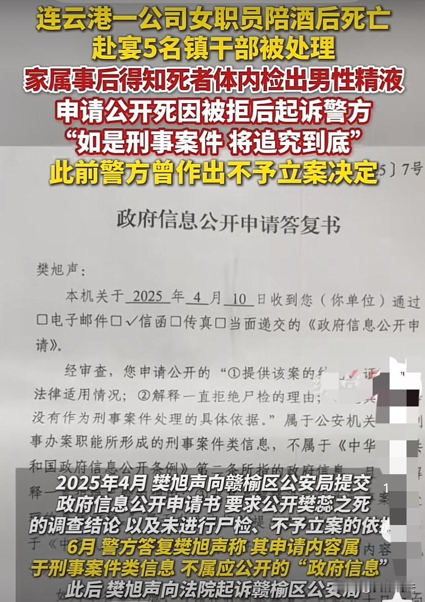 江苏连云港,女子参加单位老板宴请镇领导的酒局,次日,疑似酒精中毒身亡。事后,赴宴镇长等5名干部被处理,家属获得200多万元赔偿。过了一段时间,女子父亲听闻女子遗体内检出男性体液等,对女子死因产生怀疑,要求警方公布女子死因等信息,未果后,将警方告上法庭! 据悉,事情大概是这样的! 樊某的女儿小樊原系一公司的职工。 1年前,小樊所在公司老板刘某为了在厂区扩建报批手续上得到镇领导的支持,便宴请镇里的领导并让小樊等员工作陪。 饭间,小樊喝了大概一杯(2两)酒后,又敬了一圈镇里的领导,连续喝了4杯酒。 酒宴结束后,众人离席,刘某安排其他员工将小樊扶到自己的办公室。 刘某的办公室是一个套间,里面还有一个卧室。 随后,刘某将小樊发到自己办公室里的卧室里,与小樊发生关系后,便沉沉睡去。 次日一早,刘某醒来发现小樊没了呼吸,便报了警,并向镇里的领导汇报了情况。 小樊死亡十多天后,小樊的父亲、丈夫等人在相关协议上签字,拿到135万元赔偿款。次日,小樊的尸体被火化。 随后,刘某又找到小樊的兄弟给了小樊的兄弟100万元。 警方调查后,认为不存在犯罪事实,决定不予刑事立案。 因违反中央八项规定精神,违规接受宴请,镇里的5名干部也纷纷被处分。 事情到此并没有结束。 小樊父亲声称,当时看到小樊的遗体时,强忍悲痛询问法医女儿的死亡原因,法医说是喝酒过多造成的。隔了一段时间,自己才听说在小樊的体内发现男性的体液,再加之不断听到关于自己女儿死亡的传言,便对小樊的死因产生怀疑,不仅向纪委举报,还向警方提出申请,要求警方公开小樊的死因、解释为何没有作为刑事案件处理的具体依据等等信息。 纪委表示,警方之所以没有立案,是因为调查后,发现刘某与小樊系情人关系。 而警方表示小樊父亲要求公布的信息一部分属于刑事案件信息,一部分属于咨询类内容,均不属于政府信息公开条例所规定公开的政府信息。 “一般的事我可以谅解!”“但如果这是刑事案件,我是要追究到底的!”警方没有公开相关信息,也让小樊的父亲更加觉得小樊得到死因可疑。 于是随后,小樊的父亲便将警方告上法庭。 法庭上,警方仍然坚持认为,小樊的父亲申请公开的信息一部分属于刑事案件信息,一部分属于咨询类内容,均不属于政府信息公开条例所规定公开的政府信息。 小樊的父亲则认为小樊死亡从未被刑事立案,未进入刑事侦查程序,因此相关信息并非警方警方所说的“刑事案件类信息”,部分内容属于咨询类内容也不是拒绝公开信息的法定事由。 此外,小樊的父亲提到小樊的死因问题,还表示自己没有看过厂区和镇政府的监控视频,多次向警方提出,被告知“监控设备有故障!”还曾多次要求尸检,但是警方未进行尸检。 据悉,庭审结束后,法庭并未当庭宣判。 那从法律上该如何此事呢? 《政府信息公开条例》第2条规定,本条例所称政府信息,是指行政机关在履行行政管理职能过程中制作或者获取的,以一定形式记录、保存的信息。 可见公安机关依法履行刑事司法职能而产生的信息确实不是《政府信息公开条例》规定的政府信息。咨询类事项因未形成固定文件,行政机关也可不公开。 还应当注意的是,根据《公安机关办理刑事案件程序规定》第168条规定,公安机关接受案件时,应当制作受案登记表,并出具回执。 第171条规定,对接受的案件,或者发现的犯罪线索,公安机关应当迅速进行审查。对于在审查中发现案件事实或者线索不明的,必要时,经办案部门负责人批准,可以进行初查。…… 第175条规定,公安机关接受案件后,经审查,认为有犯罪事实需要追究刑事责任,且属于自己管辖的,经县级以上公安机关负责人批准,予以立案;认为没有犯罪事实,或者犯罪事实显著轻微不需要追究刑事责任,或者具有其他依法不追究刑事责任情形的,经县级以上公安机关负责人批准,不予立案。…… 也就是说,刑事案件正式立案前,其实还有个受案程序,而按照刑事案件受案,所产生的信息自然也属于刑事案件的信息。 具体到本案,也就是说,小樊的父亲如果想到通过政府信息公开的方式获取自己想要的信息,基本没有戏! 当然,这也不说,小樊的父亲只能认了。 小樊的父亲如果对小樊的死因存在疑问,其实还可以通过向检方申请立案监督,并在过程中通过律师获取相关信息等方式获取想要的信息。 这事您怎么看?欢迎在评论区留言,与大家一起交流您的看法! ------ 关注@安律说法 案例中看人生百态,法律中寻破局之法!