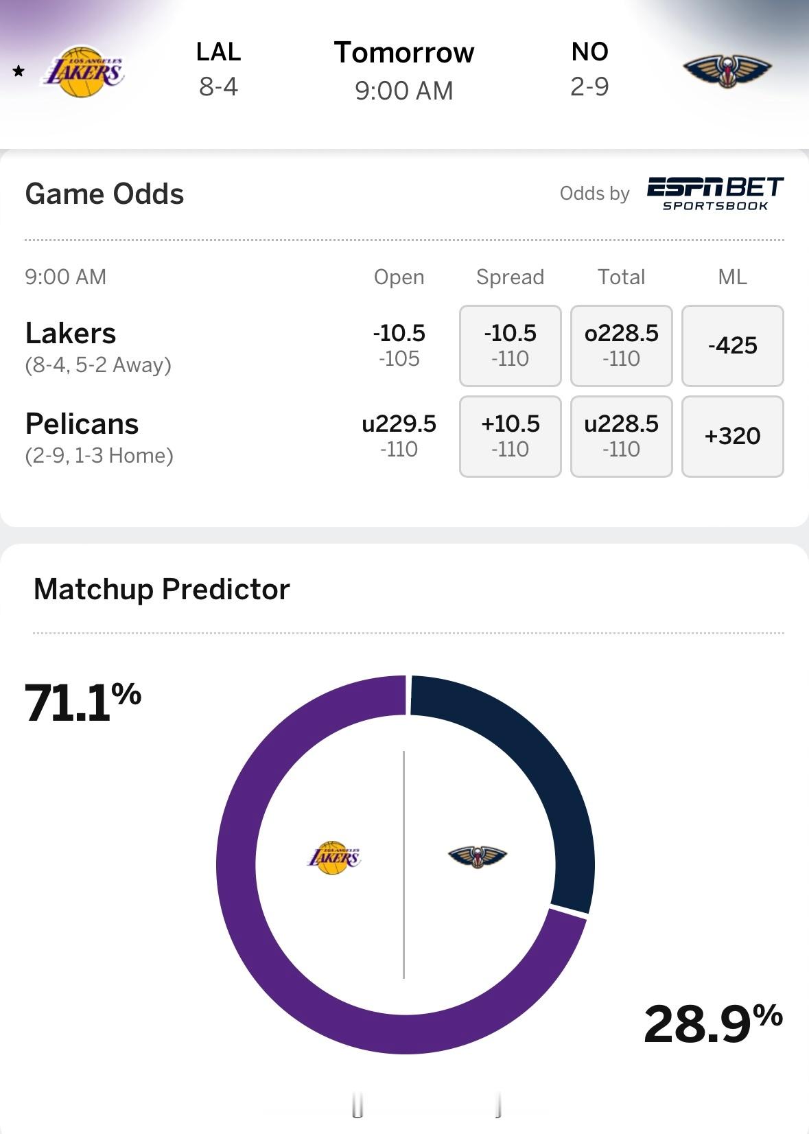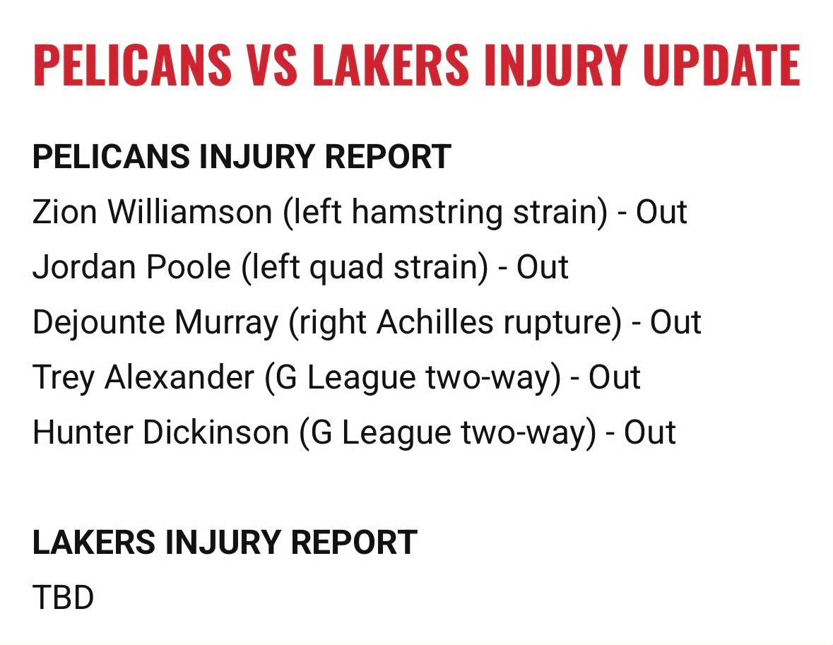 NBA杯,湖人明日9点对阵鹈鹕,ESPN给出获胜概率:湖人71.1%、鹈鹕28.9%。蒂耶罗(左膝手术恢复)出战成疑詹姆斯(右坐骨神经痛)、文森特(左脚踝)缺席比赛。锡安-威廉姆森(左腘绳肌拉伤)、乔丹-普尔(左股四头肌拉伤)、德章泰-穆雷(右跟腱断裂)、特雷-亚历山大(发展联盟双向合同球员)、亨特-迪金森(发展联盟双向合同球员)缺席比赛。飞行里程927km,当前指数,鹈鹕主场+10.5。
