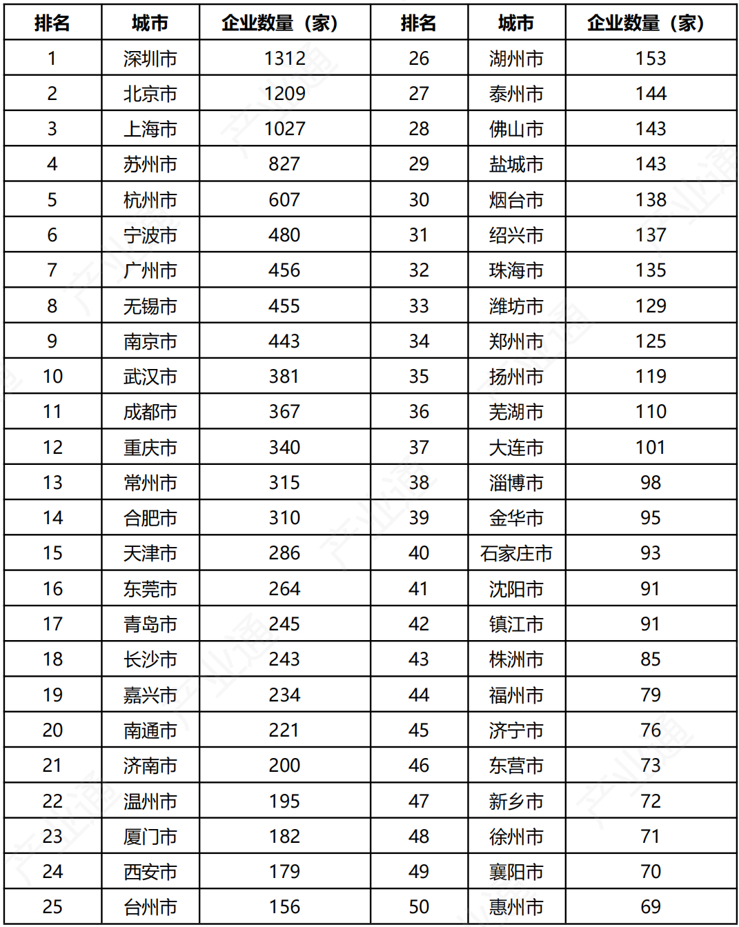 专精特新城市分布 top50,深圳厉害,北京上海也是功力深厚,但苏州还是牢牢站稳了 top5 的位置,杭州也不错,看来不止有六小龙。宁波是老牌的专精特新之城,我最熟悉的广州排在第七。西部的重庆成都和中部的合肥都进入了前十五。东北最靠前的是大连和沈阳,也是唯一进入到 top50 的。江苏的优等生是最多。(数据来自上奇)