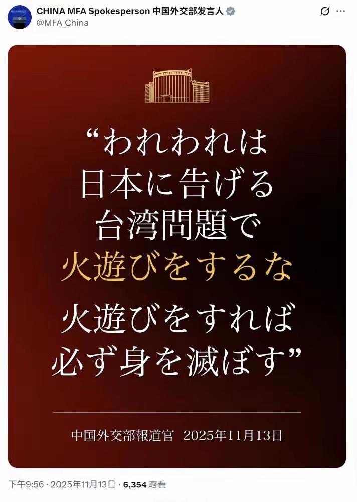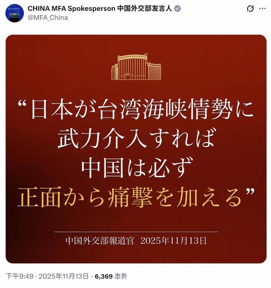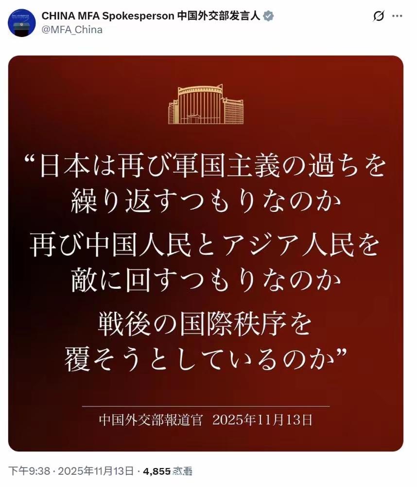 昨天,中国外交部账号连发三则日语推特,以空前严厉的口吻再三正告日本。 1)日本是打算重蹈军国主义的覆辙吗?是打算再次将中国人民和亚洲人民视为敌人吗?是企图颠覆战后国际秩序吗? 2)如日方胆敢武力介入台海局势,中方必将迎头痛击。 3)我们正告日本,在台湾问题上不要玩火,玩火者必自焚。 另外说明:日本若再敢无端挑事,中国可不经联合国安理会授权直接对其采取军事行动,且这么做完全合理!合法!合规! 联合国宪章第53条授权反法西斯同盟国,若日德意等原轴心国再次推行侵略政策,可直接采取包括军事行动在内的强制手段,无需安理会批准。 第107条进一步明确,战胜国对二战中的敌国采取或受权执行的相关行动,不会被联合国宪章取消或禁止。中国是二战核心战胜国,当日本出现军国主义复活、有侵略倾向等情况时,自然可依据这些条款采取包括动武在内的一切必要行动。 中日 日本