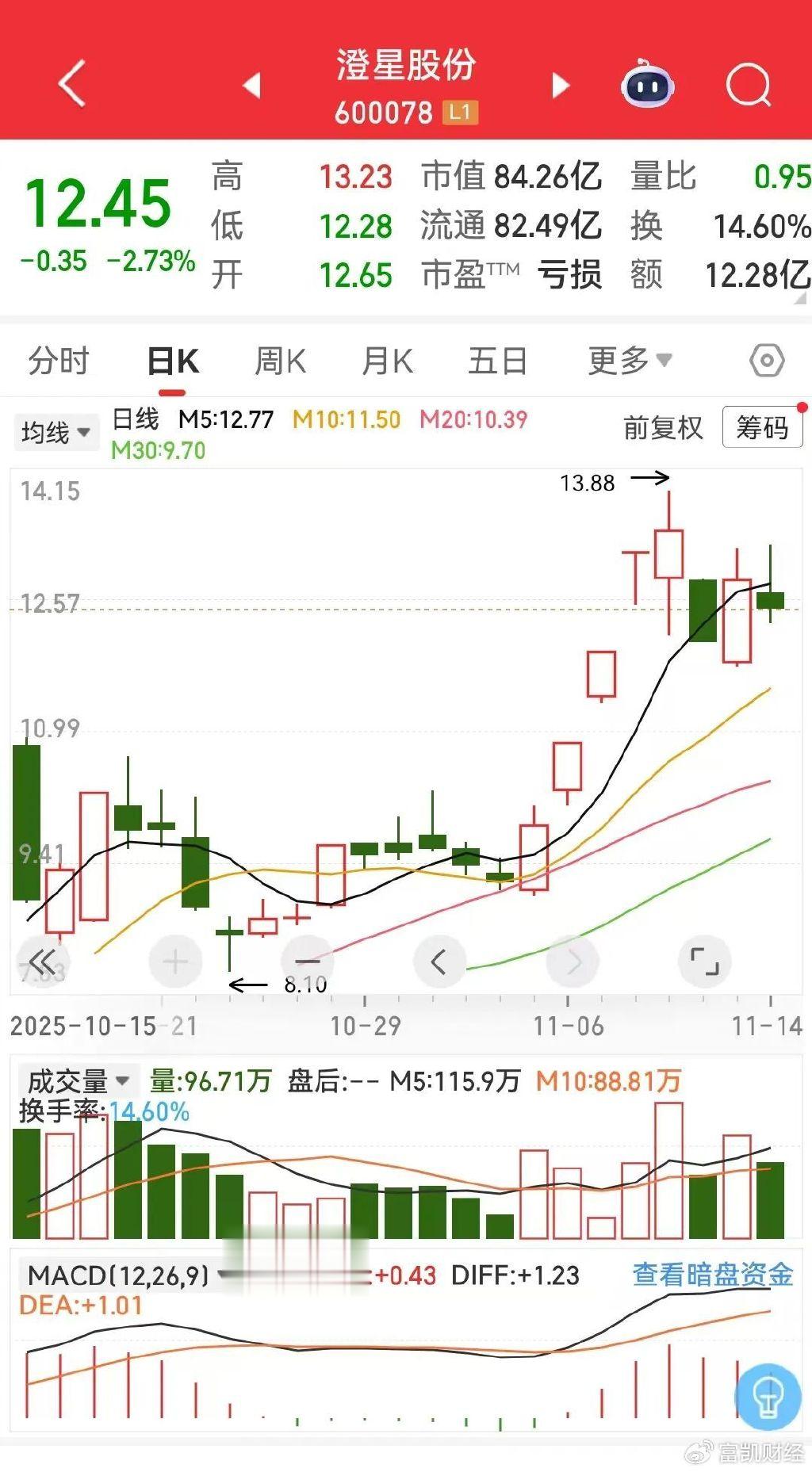 从10月9日起,澄星股份开始了一轮飙升行情,该股连续收出了4个涨停板。随后调整半个多月后,该股再度开启新一轮升势,并于11月11日盘中创出了13.88元的年内新高。短短一个半月时间,该股涨幅就已翻倍。