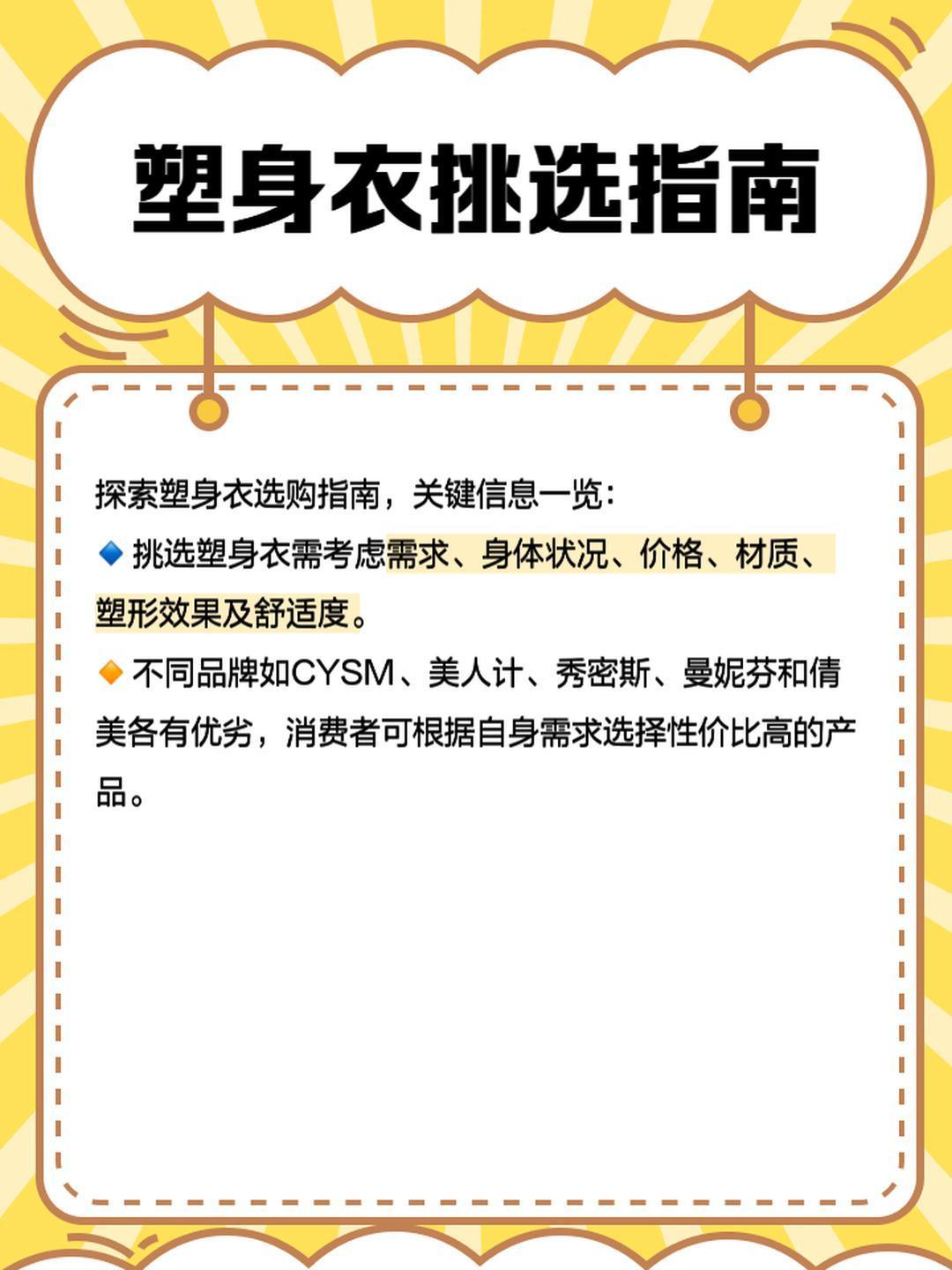 挑选塑身衣其实有很多门道,首先要考虑的是自己的需求和身体状况。不同品牌和款式的塑身衣在价格、材质、塑形效果和舒适度上各有优劣。