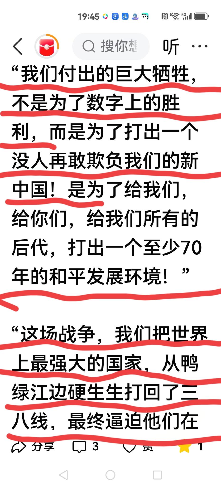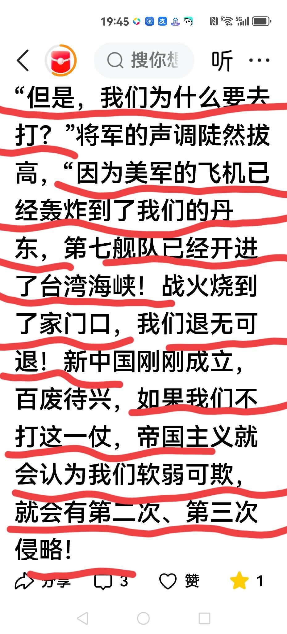 【为什么要打?】 金:美飞机轰炸丹东,美第七舰队开进湾湾海峡。 我们付出巨大牺牲,不是数字上胜利,而是没有人敢欺负我们,换来70年和平。 还有一个故事,流传很久就是美军司令克拉克承认:我成了历史上第一位在没有胜利的停战协议上签字的美军司令。 这个故事真假很难判断,因为美军从来没有认为自己失败。 为什么要打?网友们留言讨论?