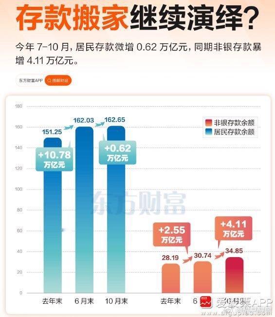 【存款搬家继续演绎?下半年非银存款暴增4万亿】“存款搬家”再度成为市场焦点。11月13日,央行公布2025年10月金融统计数据报告。数据显示,10月居民存款减少1.34万亿元,同比少增7700亿元;非银存款增加1.85万亿元,同比多增7700亿元。下半年“存款搬家”始终是投资者热议的话题。此前的7-8月份,居民存款合计减少了1.01万亿元,非银...