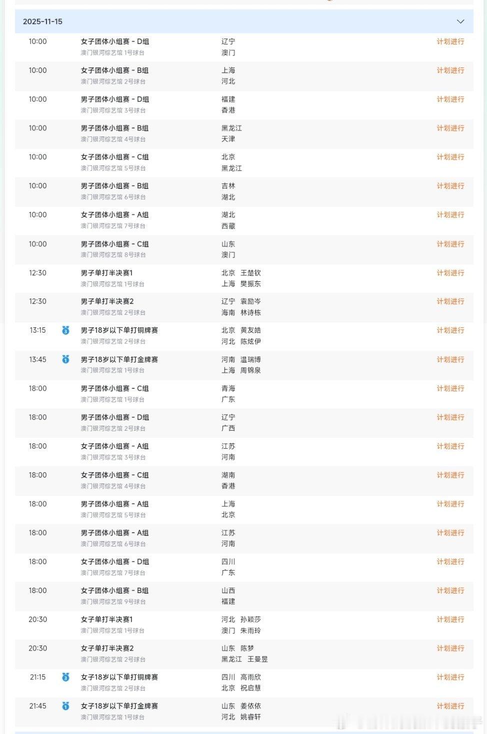 2025年第十五届全运会乒乓球第九比赛日赛程:11月15日10:00 T1 女团小组赛 D组:辽宁VS澳门10:00 T2 女团小组赛 B组:上海VS河北10:00 T3 男团小组赛 D组:福建VS香港10:00 T4 男团小组赛 B组:黑龙江VS天津10:00 T5 女团小组赛 C组:北京VS黑龙江10:00 T6 男团小组赛 B组:吉林VS湖北10:00 T7 女团小组赛 A组:湖北VS西藏10:00 T8 男团小组赛 C组:山东VS澳门12:30 T1 男单半决赛:王楚钦(北京队)VS樊振东(上海队)12:30 T2 男单半决赛:袁励岑(辽宁队)VS林诗栋(河南队)13:15 T2 青年组男单铜牌赛:黄友皓(北京队)VS陈炫伊(河北队)13:45 T1 青年组男单金牌赛:温瑞博(河南队)VS周锦泉(上海队)18:00 T1 男团小组赛 C组:青海VS广东18:00 T2 男团小组赛 D组:辽宁VS广西18:00 T3 女团小组赛 A组:江苏VS河南18:00 T4 女团小组赛 C组:湖南VS香港18:00 T5 男团小组赛 A组:上海VS北京18:00 T6 男团小组赛 A组:江苏VS河南18:00 T7 女团小组赛 D组:四川VS广东18:00 T9 女团小组赛 B组:山西VS福建20:30 T1 女单半决赛:孙颖莎(河北队)VS朱雨玲(中国澳门)20:30 T2 女单半决赛:陈梦(山东队)VS王曼昱(黑龙江队)21:15 T2 青年组女单铜牌赛:高雨欣(四川队)VS祝启慧(北京队)21:45 T1 青年组女单金牌赛:姜依依(山东队)VS姚睿轩(河北队)