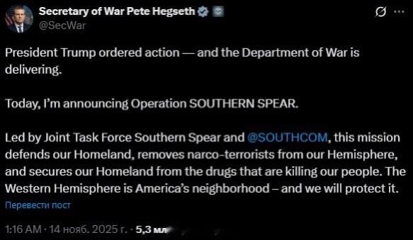 美国战争部长宣布懂王已下达作战命令,代号“南方之矛”战争部已在执行懂王命令之中。作战目的,将“贩毒份子”赶出西半球。因为西半球是美国的地盘,必须捍卫。TMD,毒贩云集的地方不是芝加哥,不是纽约,不是美墨边境?披上“打击毒品犯罪”光鲜外衣,就能掩盖试图破坏颠覆委内瑞拉,哥伦比亚合法政府的肮脏内在了?这两天,各位看官请把目光转向委内瑞拉。看看“最好的和平爱好者”懂疯批能不能做到它谋划了几个月的事。看看它有没有胆量让美军登陆委内瑞拉。