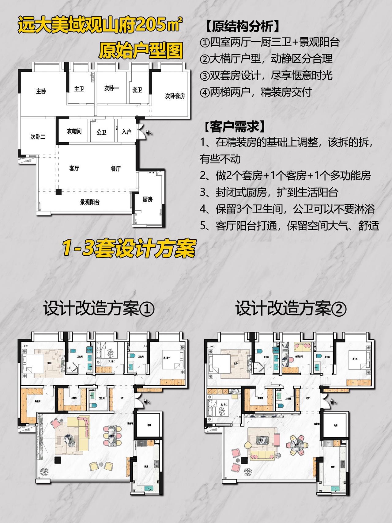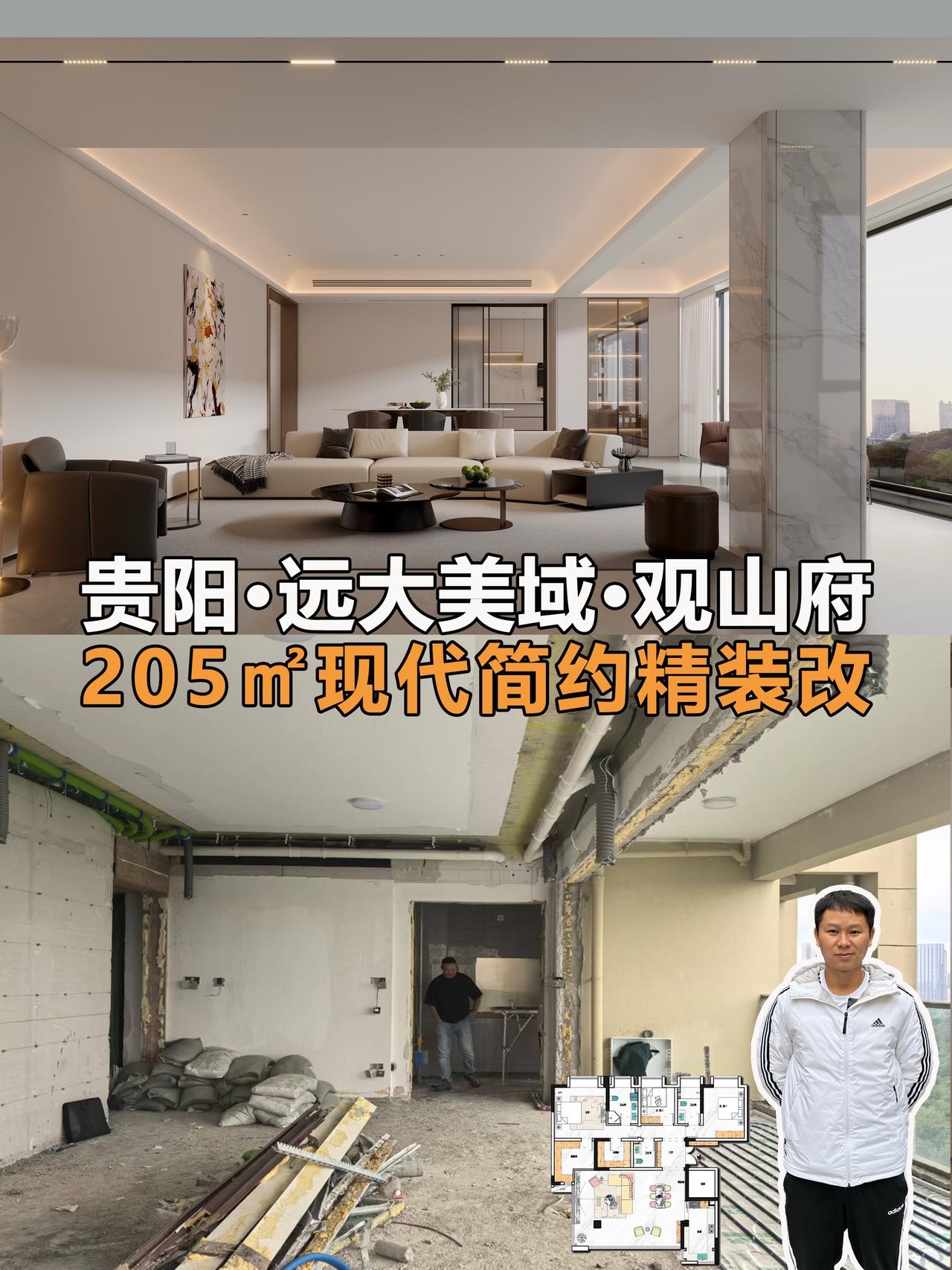 哈喽❗️我是10年装修设计经验阿杰❗️ 谁没被精装房的“千篇一律”劝退过?远大美域观山府这套205㎡房子,交付拿房很多地方设计不合理,风格老气,窗外的观山湖视野都被浪费了。 从满地狼藉的拆改现场,到现在推门就能看见的开阔通透——精装房不用“凑活住”,改对方向,家就能长成你想要的样子。 项目信息📋 📍楼盘:远大美域观山府 🏠户型:大平层(精装房) 📏面积:205㎡ 🎨风格:现代简约风格 📝【客情需求】 1、在精装房的基础上调整,该拆的拆,有些不动 2、做2个套房+1个客房+1个多功能房 3、封闭式厨房,扩到生活阳台 4、保留3个卫生间,公卫可以不要淋浴 5、客厅阳台打通,保留空间大气、舒适 🏠【原始户型分析】 ①四室两厅一厨三卫+景观阳台 ②大横厅户型,动静区分合理 ③双套房设计,尽享惬意时光 ④两梯两户,精装房交付 🎨【设计解说】 打掉阳台推拉门,进门就能看见落地窗的开阔,205㎡的尺度感直接拉满,朋友聚会、家庭互动都有足够场景。 用悬浮无主灯吊顶+柔光大地砖+低饱和木色做基底,电视墙选细纹大理石提升质感,艺术挂画和皮质单椅当点缀——没有多余造型,却藏着耐看的松弛感。 精装房原有管线全做隐形处理,卧室定制柜嵌入墙体,卫浴区用玻璃隔断扩宽视觉,连阳台都无缝纳入客厅,保留观景优势的同时,让每一寸空间都“好用不闲置”。 👉【关于我】 一位充满热情、细心、靠谱的90后设计师。拥有别墅、洋房、跃层、大平层、普通住宅10年设计经验。为装修设计发愁的你排忧解难! ✅擅长风格 意式、新中式、现代简约、奶油风、宋式美学、中古风、法式风、现代轻奢等… 📄【个人案例】 中铁阅花溪|中铁逸都|中铁阅山湖|阅山湖云著|华润悦府|中海映山湖|茅台广场|美的林城|金融城|融创九樾府|中海印龙泉|华润九悦|龙湖天曜|龙湖湖山原著|万科鸣翠|万科麓山|铁建城|龙湖舜山府|远大美域|观山小区|建发和玺|保利公园 。。。。。。 贵阳装修 远大美域 远大美域观山府 精装改造