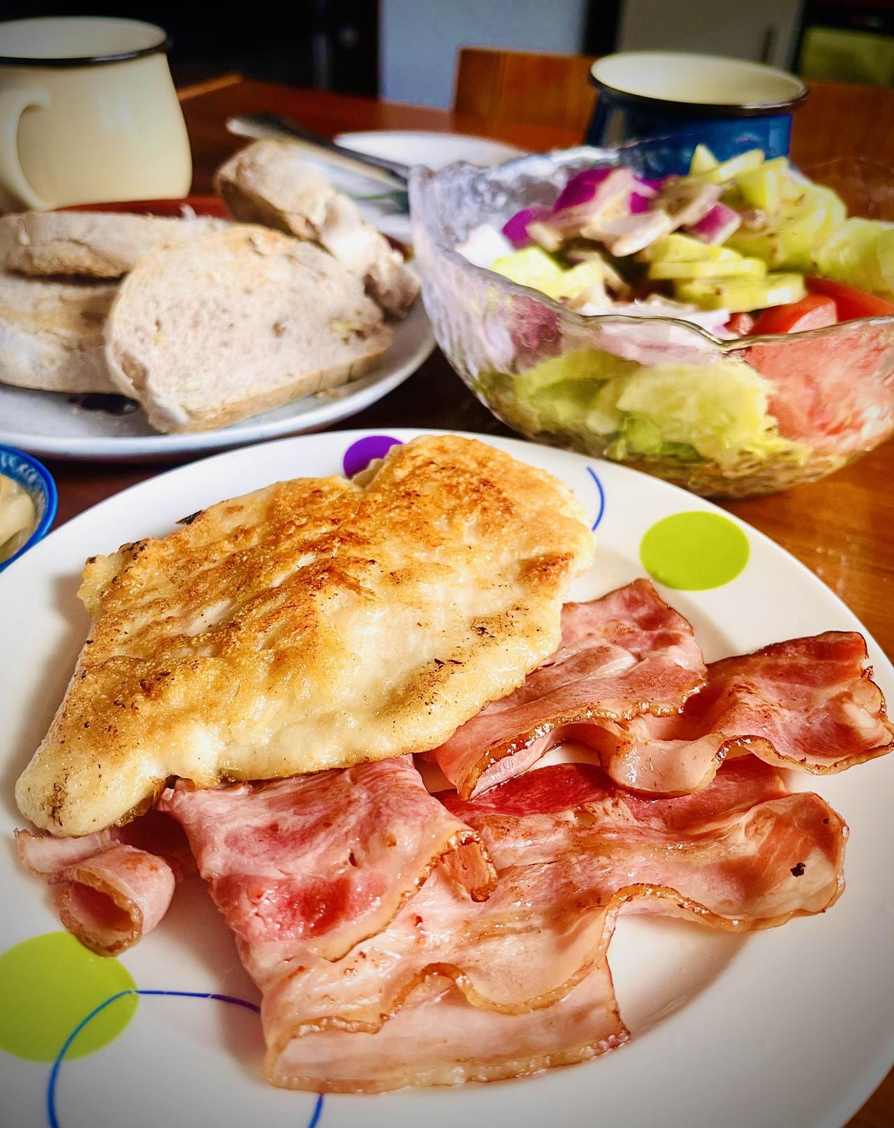 法国乡村海盐面包,零糖零油。香煎鸡排和培根,巴氏杀菌牛奶配蔬菜沙拉。