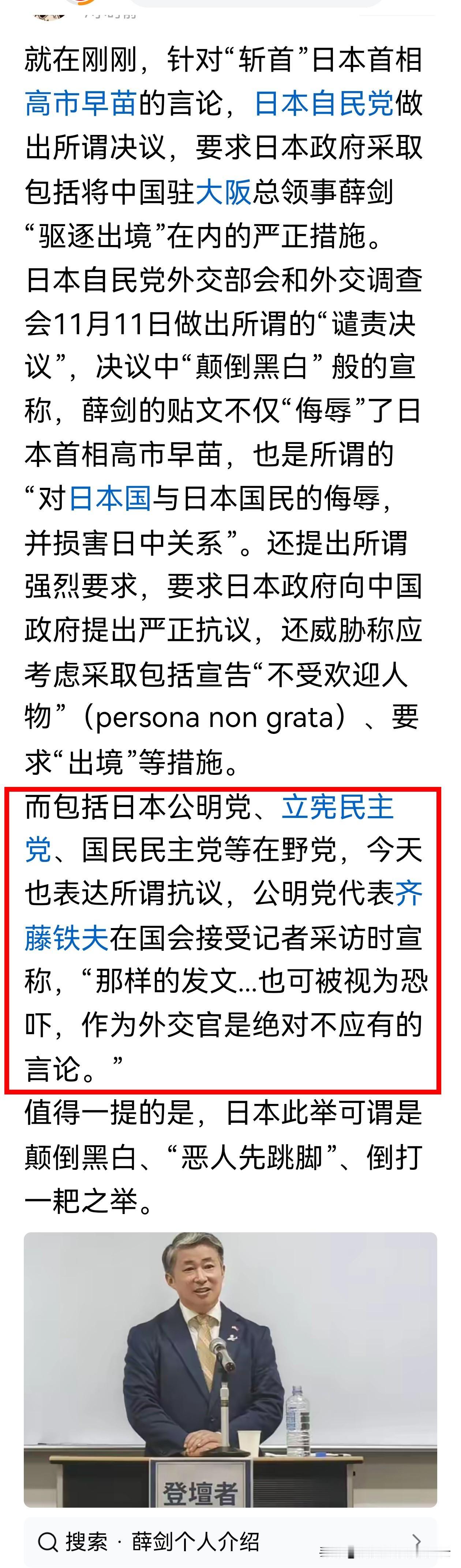 日本社会对中国驻大阪总领事薛剑有关“斩首”贴文的反应从第一幅图中这个民意调查的结果可见一斑,对高市早苗“台湾有事视同日本的生存危机,可以行使集体自卫权”的狂妄叫嚣表示支持的高达82%。 这一结果充分说明,日本从上到下已几乎全面右化,军国主义已经具备了在日本死灰复燃的土壤。 薛剑遭到日本从执政党到在野党(见第二幅图)、从政府到民间的全面围攻也充分暴露了日本人的“恶劣”。 这种恶劣起码表现在两点: 其一,日本人擅长断章取义,倒因为果,明明是高市早苗严重挑衅在前,却倒打一耙,恶人先告状; 其次,从事件背景和语言逻辑上看,薛剑所谓的“斩首”显然是针对一个集体(此处当然是指妄图染指台海的日本政府及其军队),却被它们恶意地歪曲成是特指高市早苗个人,从而偷梁换柱,转移焦点,混淆视听,妄图占据道德高点,欺骗和煽动不明真相的人,形成整个日本人的集体破防,进而撒泼耍赖。 要我说,薛剑完全没必要撤回第一篇贴文,这句话即使被恶意解读为是指高市早苗的“脏头”,也是有个前提的,前提就是因为你的“肮脏的头颅”伸到了不该伸的地方才会被斩断,这有什么不对呢?