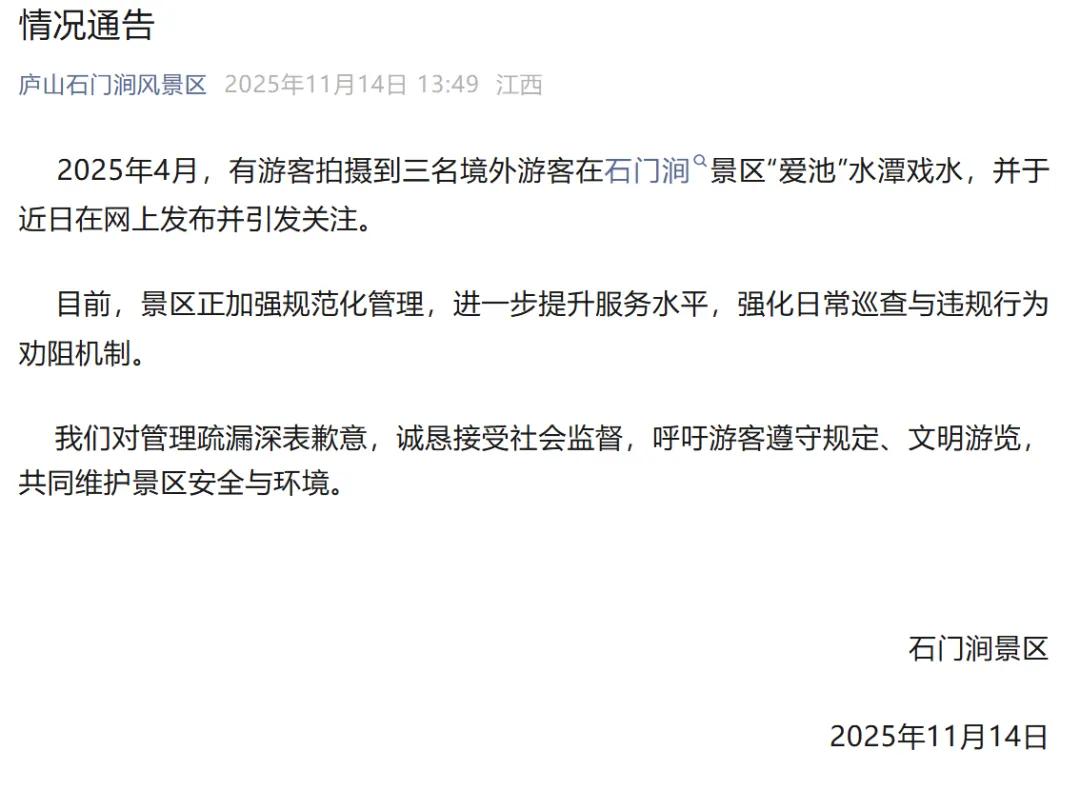 三名外籍男子在庐山景区“戏水”,景区致歉:事发4月份,景区正加强规范化管理……什
