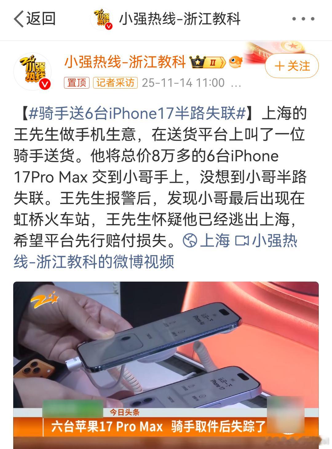 等会,这么贵重的物品,你不保价的???怎么做生意的???总价都8万多了,当面拍视频+保价+留串号啊。别说骑手失联了,路上整点磕磕碰碰的,也遭不住啊。
