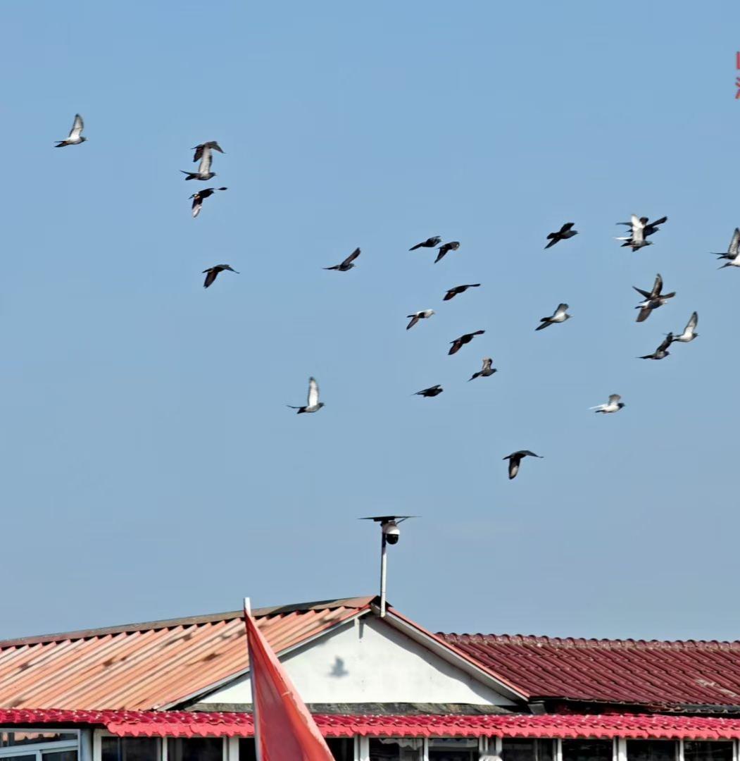 分享一张相册里随手拍的天空天蓝得透亮,鸽群扑棱着翅膀在云底下撒欢儿,红屋顶都沾了这阵雀跃的风——连空气里都飘着轻快的劲儿。