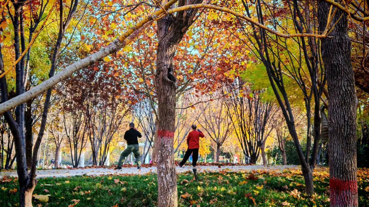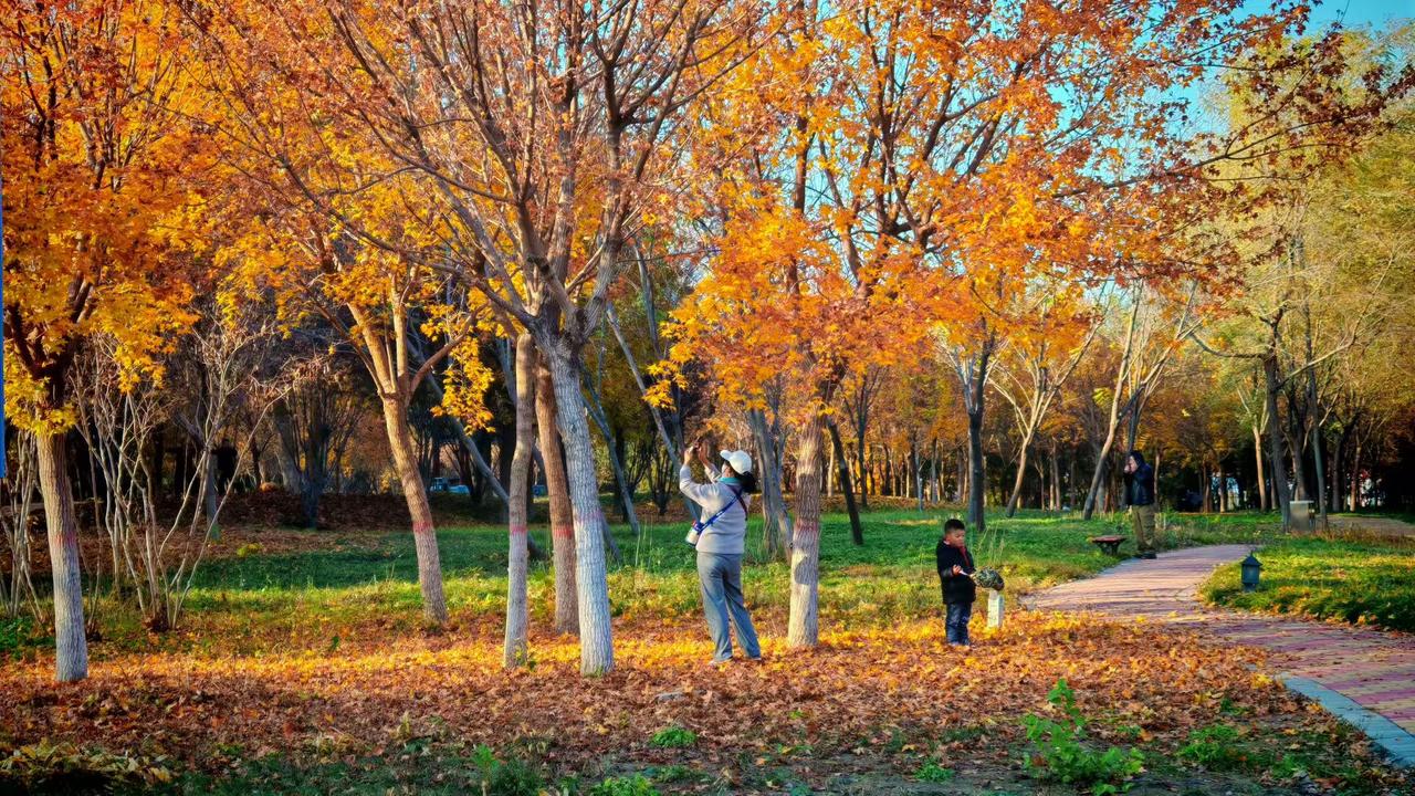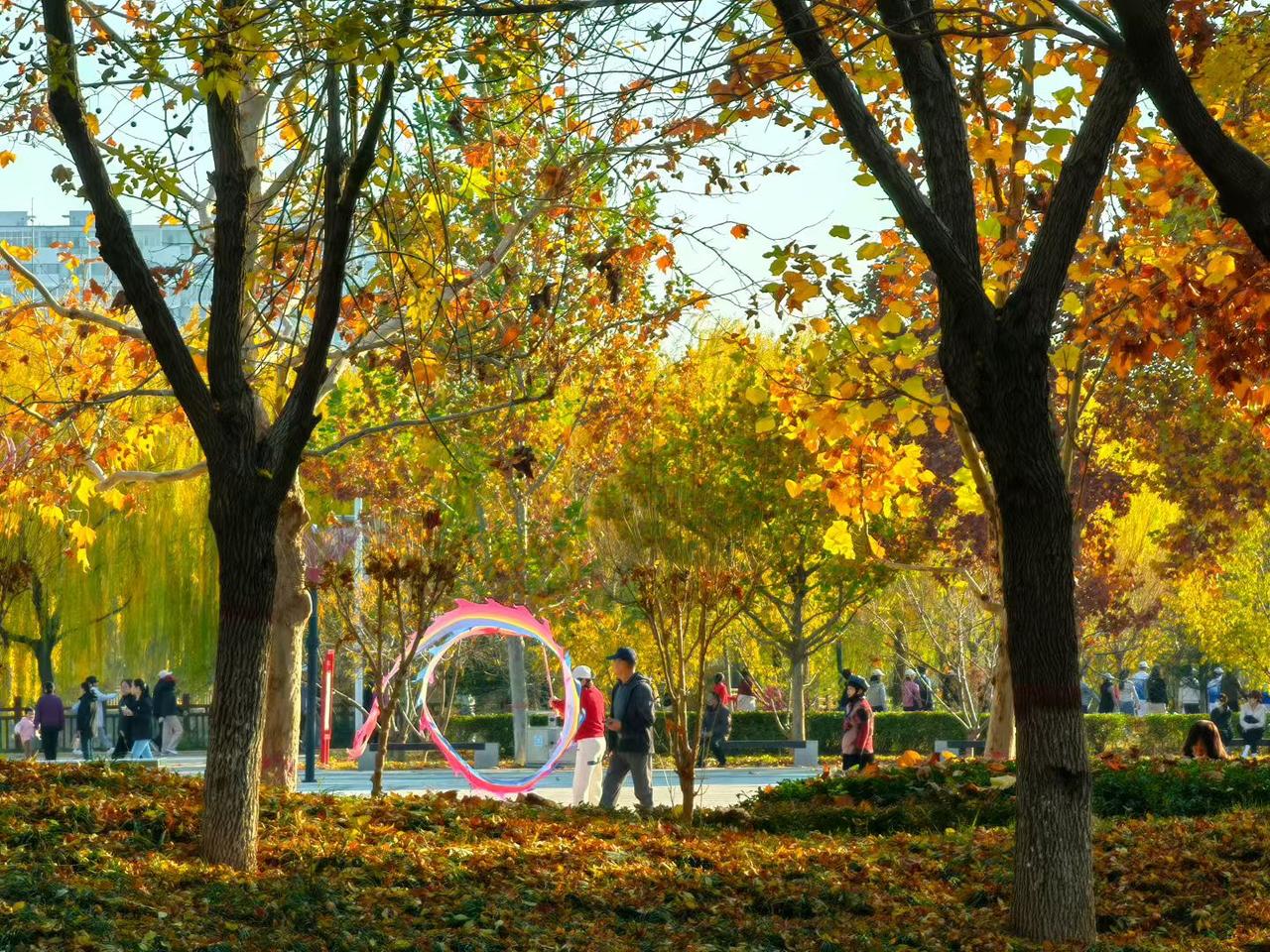 分享随手拍下的风景照这秋太会来事儿啦!树叶子裹满阳光变成金片片,脚底下踩着软乎乎的落叶毯。你看那彩绸转得像朵花,连散步的人都裹在暖黄里笑——这日子甜得直冒热气儿~