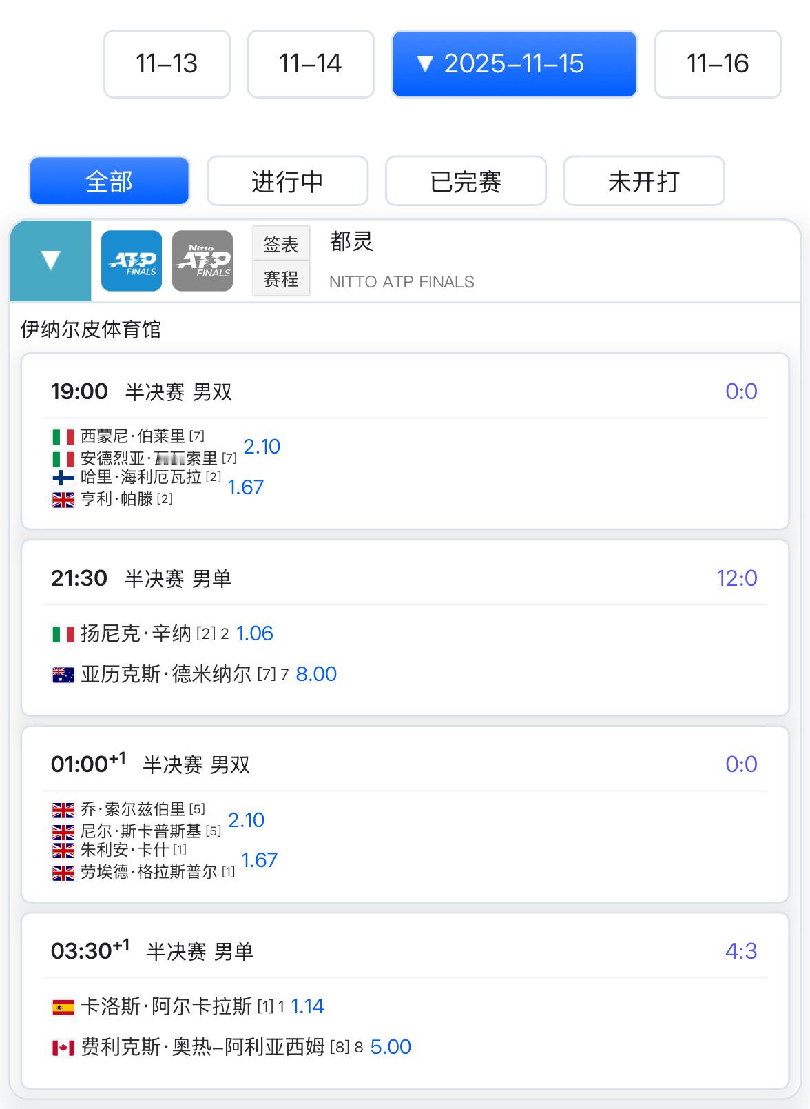 今晚ATP总决赛半决赛赛程⏰辛纳先打,阿卡后打⬇️21点30: 凌晨3点30: